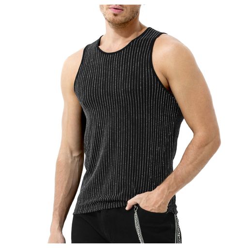 [ArjenKroos]Tシャツメンズタンクトップステージ衣装ノースリーブスパンコール男性用カットソークルーネックベスト派手キラキラメタリック光沢トップスAK3311-A1-シルバーxブラック-1枚S