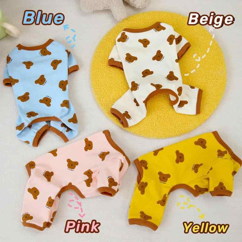 ペット服 犬 猫 コットン 柔らかい素材 カジュアル かわいい ベア プリント 四脚 ルームウェア 青 ピンク イエロー ユニセックス オールシーズン 室内 ファッション おしゃれ 快適