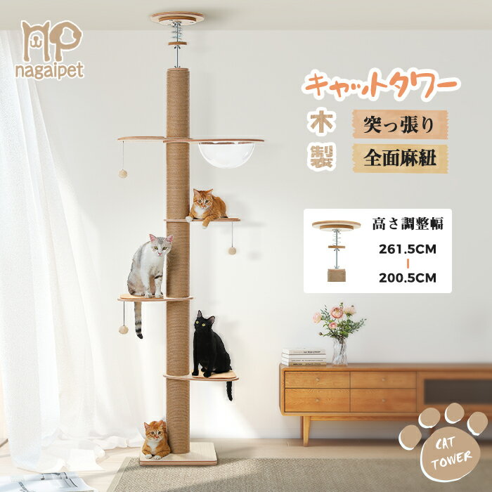 【1000円OFF・タイムセール】キャットタワー 突っ張り 木製 全面麻紐 爪研ぎ 直径10.5cm 極太 スリム 大型猫用 猫タワー 木目調 夏 木登りタワー おしゃれ 多頭飼い クリアボウル 宇宙船付き 滑り止めマット おもちゃ 登りやすい インテリア ベージュ 高さ調整幅200-261cm