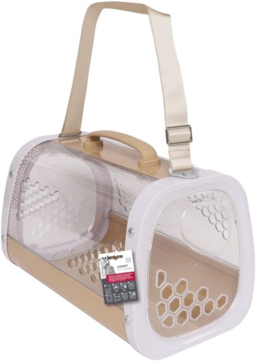 こんなデザイン見たことない!日本初上陸のベルギーブランドのおしゃれなペットキャリー ★ハチの巣模様の空気穴がポイント!おしゃれで映えるペットキャリー★ 〇おしゃれなハチの巣デザインのクリアペットキャリー ・空気穴の形がハチの巣になっている 〇持ち方いろいろ ・ショルダーベルト&ラバーハンドルで移動ラクラク 〇ワイドな広々空間 ・全面クリアで景色が見れるので、お出かけが楽しい 〇出し入れスムーズ ・ボタンを押すとがばっと大きく開きます。 〇ナデナデ小窓つき ・内側に開くナデナデ小窓、お出かけが苦手な子も安心。 ■他にないおしゃれでかわいいデザイン!ハチの巣模様の空気穴がポイント♪ ■側面が上部に大きく開き、わんちゃん・ねこちゃんの出し入れも簡単! ■外側からのみ開く側面の小さな開口部から手を入れることができ、 ドアを開けずにわんちゃん・ねこちゃんを撫でてあげることができます。 緊張しがちなデリケートな子でも安心です。 ■ショルダーストラップとプラスチックハンドル付きなので、 肩掛けも手持ちもどちらでも使えます。 ■底面には滑り止めが付いているので、置いた状態で滑りにくく安心です。 [仕様] サイズ 幅45.5×奥行27×高さ29(cm) 体重目安 ~5kg 素材 ABS樹脂・透明ポリカーボネート デザイン ベルギー 生産 中国ハチの巣模様の空気穴 HONEYペットキャリー ハニーペットキャリー