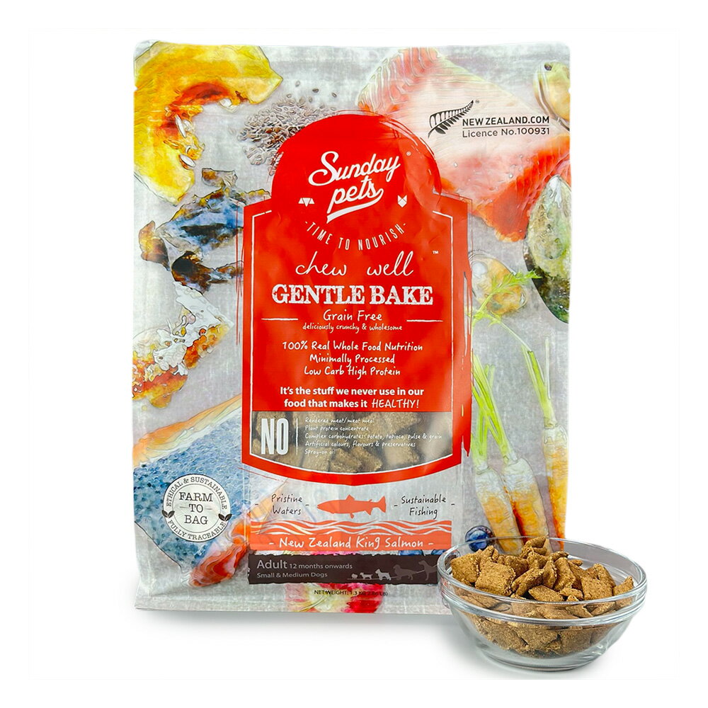 ※お知らせ※2025年1月7日以降ご注文より価格改定(値上がり)となります。※お取り寄せ※入荷待ちです。2024年12月13日から18日頃の発送となります。予めご了承くださいませ。 小型&中型の成犬用(12ヶ月以降の小型および中型の成犬) 総合栄養食 穀類を含まず、たんぱく質が豊富で、炭水化物が少ない、自然な食事によく似た、健康的なライフスタイルに不可欠な栄養素を提供します。 独自の形状により、犬は食べ物をゆっくりと噛んで味わい、素早く飲み込まないので消化が良くなり満腹感も得られます。 温かくするとより一層おいしいので、ぬるま湯、肉または野菜のスープを加えるとおいしさが増します。 また、手でパキパキ割ることが出来るためトレーニング用のトリーツとしてもご使用いただけます。 手作りフードのトッピングとしても最適です。 丸ごとの肉、内臓、野菜、果物が100%使用されています。栄養素と風味が自然に際立つ、シンプルで新鮮で健康的な食材を中心に構築されています。犬が成長するために必要なほぼすべての栄養素を、優しく焼くことによって生体利用効率の高い形で自然に提供します。不必要なものは何も加えられず、重要なものは何も取り除かれていません。 加工を最小限に抑え、より多くの味と栄養を守るためシンプルに自宅で作るように3ステップで作られています。1.新鮮な材料を丸ごとブレンドします。 2.平らにして、「よく噛む」小さなビットに切ります。 3. 低温でゆっくりと少しずつ焼きます。 穏やかに焼くプロセスは、食材全体から水分を優しく取り除き、自然の良さと味をよりよく保護します。失われた風味や栄養を補うために、風味を高めるスプレーオイルのような人工的なものや追加物を加える必要はありません。優しく焼くことで、犬が大好きなカリカリとした食感も加わります。 ユニークな Chew Well 形状、大きいほど優れています。犬が二度と食べ物を見ることができないかのように急いで飲み込むのではなく、消化を良くするために時間をかけて食べ物を噛んで味わうことを犬に促します。犬が噛むと、犬の歯を支えている骨が「鍛えられ」、歯を強く保つのに役立ちます。 特別なおやつとして、新鮮な果物や野菜を加えてください。温かくして、お湯、肉や野菜のスープを加えるとさらに美味しくなります。まるで自家製のような味わいになります。 Chew Well形状:バラバラで大き目のこのユニークで革新的な形状はペットが各キブルを噛むことで、よりゆっくりとした速度で食べることを促します。「噛む」のではなく「飲み込む」でたべているわんちゃんやねこちゃんはたくさんいますがあまり噛まずに飲み込むと、消化不良、胃潰瘍、便秘、嘔吐、膨張、食糞などの問題を引き起こす可能性があります。これらの問題を解決するための深い思考と研究から生まれました。 ジェントルベイクについて:消化性と自然なおいしさを高めるために、穏やかな焼き方では、非常に「硬いペレットに圧縮」したり「均一な形状に加工」したりすることなく、柔らかくサクサクとした食感に仕上げます。栄養素のほぼ 90% が保持されます。消化しやすく、より多くの栄養素が吸収されます。これは、便の量が少ないことからもわかります。サンデー ペッツでは、おいしさは自然の味です。穏やかな焼き方では、より多くの新鮮な肉を使用でき、他の加工方法では通常使用される香料の追加やキブルへの保存脂肪の噴霧は不要です。(サンデー ペッツは、ほとんどの押し出し加工されたドライフードのように油っぽくなく、油っぽくないことがお分かりいただけます) 【原材料名】 キングサーモン64%、 野菜34.9%(カボチャ、亜麻仁、ニンジン、オオウキモ(海藻)0.2%)、緑イ貝0.2%、ブルーベリー0.2%、マヌカハニー0.1%、リンゴ酢0.1%*季節により使用します。 【栄養添加物】 (kgあたり) E6亜鉛(グリシン水和物の亜鉛キレート) 90 mg、E4銅(グリシン水和物の銅キレート) 2 mg、セレン酵母 0.15 mg、E5マンガン(グリシン水和物のマンガンキレート) 10 mg、ビタミンE 60 IU、ビタミンB1 3 mg、ビタミンD3 600 IU、葉酸 0.2 mg 【保証分析値】 粗タンパク質38%以上、粗脂肪18%以上、粗灰分10.9%以下、粗繊維2%以下、水分9%以下 カルシウム1.5%以上、リン1.1%以上 カロリー:396kcal/100g 【給与量】(一日当たり推奨量) 体重2〜5Kg:30g〜90g 体重5〜10kg:60g〜150g 体重10〜20kg:120g〜240g 体重20〜30kg:160g〜330g 【保管方法】 涼しく乾燥した場所で保管してください。 【使用上のご注意】 新鮮でおいしい状態を保つため、チャックをしっかり閉めてください。 輸送中に内容物が多少くずれている場合がございますが、ご了承ください。 賞味期限内にご使用ください。 本製品はペットフードですので、人には与えないでください。 天然の原料を使用しておりますので、色・形・風味・硬さが異なることがございます。 原産国:ニュージーランド 米国飼料検査官協会 (AAFCO) が定めたメンテナンス用のドッグフード栄養素を満たす栄養レベ