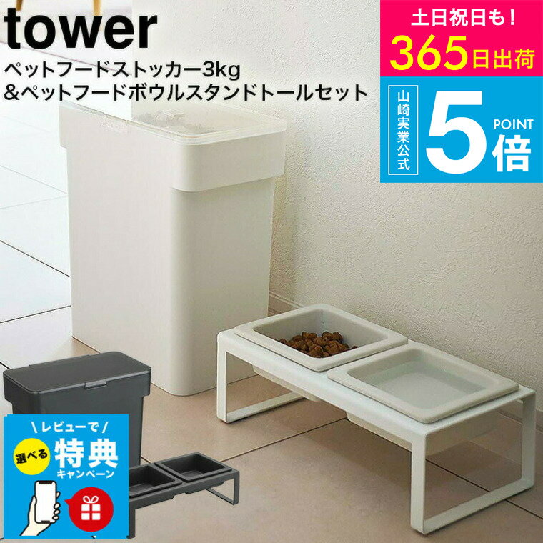 【レビュー特典】[ 密閉袋ごとペットフードストッカー 3kg 計量カップ付 & ペットフードボウルスタンドセット トール タワー ] 山崎実業 tower ホワイト/ブラック 5613 5614 4744 4745 / ペットフード ストッカー フードスタンド ペット用品 猫 犬 JGS 最強配送 送料無料