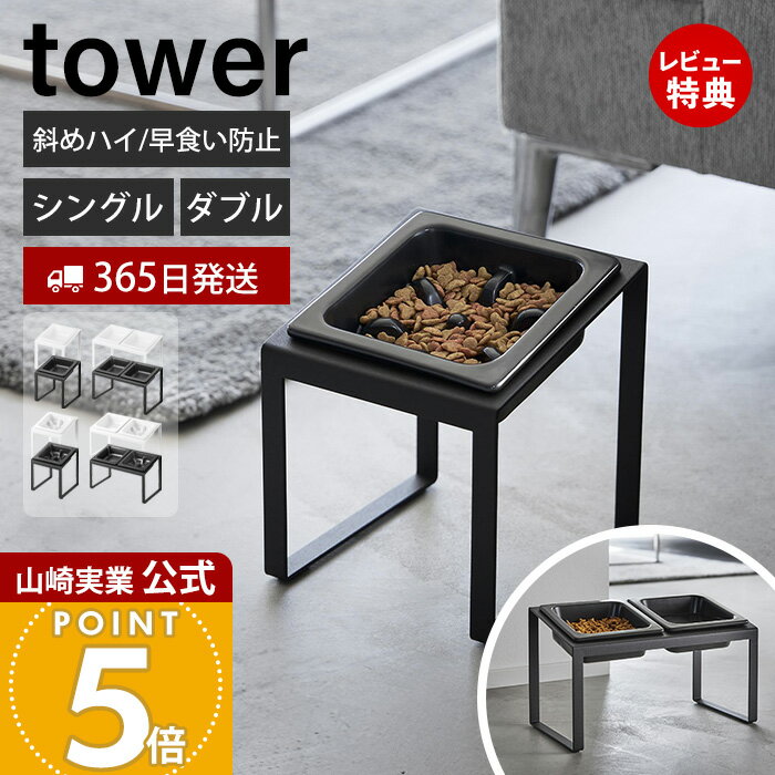 【365日出荷&当店限定特典付き】山崎実業 早食い防止 ペットフードボウルスタンドセット 斜めハイタイプ タワー tower 公式 シングル ダブル ペット用食器 エサ 水入れ 傾斜 猫 犬 ペットフード 高さ17.5 陶器 角形 10035 10239
