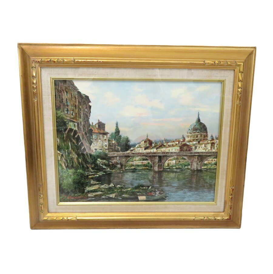 スーパーSALE限定価格!!【中古】川勝茂弘 『バチカンの見える風景 (イタリア・ローマ)』サイン入り 裏書あり 新槐樹社準委員 F6号 油彩 油絵 風景画 サン・ピエトロ大聖堂 額入り 額装 インテリア