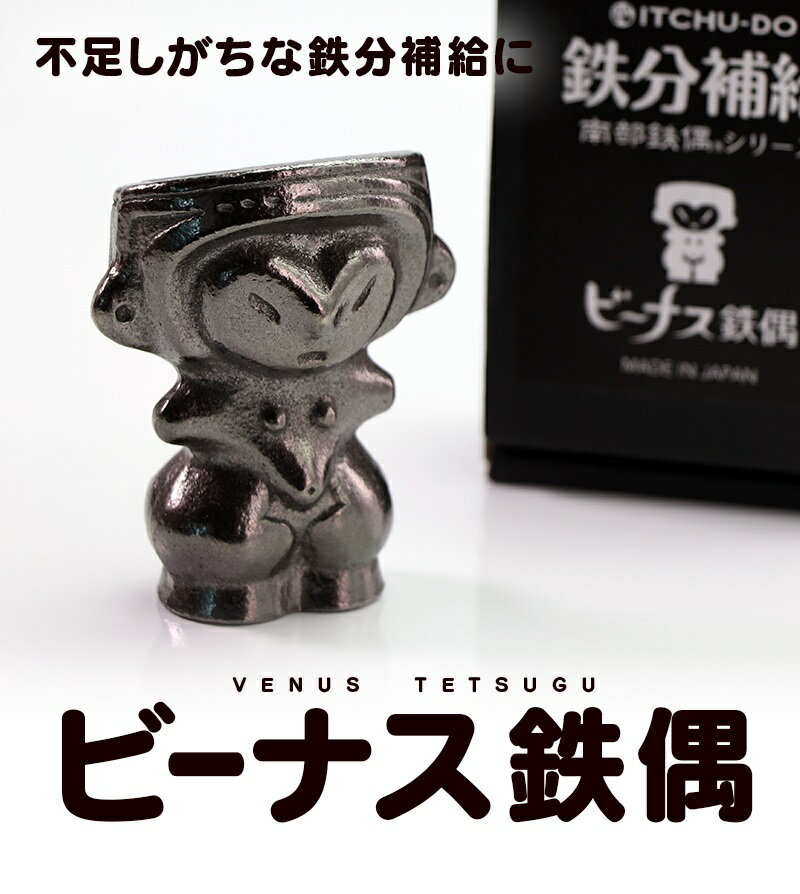 内容サイズ:W5.3×D3.5×H6.5cm重量:320g材質:鋳鉄地場産品類型【3号】(平成31年総務省告示第179号第5条)盛岡市内において実施する工程により、半分以上の付加価値が生じている。製作会社【株式会社壱鋳堂】営業時間:09:00-17:30/TEL:019-681-0560定休日:土曜・日曜・祝祭日・年末年始・お盆商品のお問い合わせ【有限会社トゥレイス】TEL:019-658-8841事業者株式会社壱鋳堂備考※画像はイメージです ※沖縄県・その他離島への発送不可 ※繁忙期はお届けが2~3ヵ月かかる場合がございます。 ※お申し込みが殺到した場合、準備ができ次第、順次発送となります。 ※お客様都合でお受取りができなかった場合、返礼品の再送は致しません。 ※配送業者のご指定はできません。 ※配達日の指定はできません。 ※返礼品に不都合があった場合(お手入れも含め)ご使用前にご連絡をください。(使用後はいかなる理由であれ交換致しかねます) ・ふるさと納税よくある質問はこちら ・寄附申込みのキャンセル、返礼品の変更・返品はできません。あらかじめご了承ください。【ふるさと納税】鉄分補給に最適 南部鉄器【ビーナス鉄偶】 雑貨 日用品 工芸品 装飾品 壱鋳堂が贈るキュートな伝統工芸品【南部鉄偶シリーズ】 安産と子孫繁栄の祈りが込められているといわれる、縄文のビーナスがモチーフのビーナス鉄偶。 日本人の5人に1人は貧血症、または準貧血症といわれています。 日頃不足しがちな成分として「鉄分」が挙げられますが、南部鉄偶から溶け出す鉄は「二価鉄」が多いことが分かっています。 実は腸で吸収される鉄分はこの「二価鉄」だけ!つまり、とても効率よく鉄分の吸収ができるのです。 お湯を沸かすとき、お鍋や煮込み料理を作るとき、鉄偶を一緒に煮込むことで自然に鉄分を摂取することができます。 二頭身の小柄で可愛らしい姿と侮ることなかれ!見た目からは想像できないほど皆さんの生活のお役に立ちます!! ●お役立ちポイントその1 みなさんの鉄分補給のお手伝い! お鍋ややかんに入れて一緒に煮込むだけで簡単に鉄分が摂取できます。 ※使用した後はとても熱くなっていますのでお気を付けください。 ●お役立ちポイントその2 貝の砂出し、黒豆やなす漬けの色だし! ●お役立ちポイント??その3 かわいい見た目で癒し効果!? ※癒し効果があるかどうかは・・・個人差がありますのでご了承ください・・・ 【鉄製品の錆について】 鉄製品は、水分が表面に付着すると直ぐにでも素材性質上、発錆が始まります。 サビが発生した=不良品、不具合というわけではありません。 鉄サビは健康衛生上、人体に害はございません。 【ご確認ください】 ※使用説明書を一緒に送付しますので、ご確認の上ご使用・保存してください。 ※鋳物のため制作工程の都合上、大きさや重量は表記と若干誤差がある場合がございます。 寄附金の用途について (1) 地域の産業を元気に!商工業・農林業など地域の経済を応援 (2) 観光・移住・歴史・文化など魅力あるまちづくりを応援! (3) 盛岡の将来を担う子ども・若者を応援! (4) 誰もが自分らしく輝ける盛岡のまちづくりを応援! (5) 芸術文化やスポーツなどを通じて生きがいを感じられるまちづくりを応援! (6)みんなで築く福祉のまちづくりを応援! (7) 誰もが健やかに生活できるまちづくりを応援! (8) 多様な主体が協働するまちへ!地域コミュニティの活性化を応援 (9) 災害に強い安全・安心なまちづくりを応援! (10)かけがえのない環境を未来へ!持続可能なまちづくりを応援 (11)快適で暮らしやすいまちへ!誰もが住みやすいまちづくりを応援 (12)市長におまかせ!元気な盛岡づくりを応援 (13)その他(寄附の使途を指定) 受領証明書及びワンストップ特例申請書のお届けについて 【受領証明書】受領証明書は入金確認後、注文内容確認画面の【注文者情報】に記載の住所に、2週間以内に発送いたします。お礼の品とは別にお送りいたします。【ワンストップ特例申請書について】ワンストップ特例申請書は、入金確認後2週間以内に注文内容確認画面の【注文者情報】に記載の住所へお送り致します。ワンストップ特例をご利用される場合、1月10日までに申請書が当庁まで届くように発送ください。オンラインによる申請と、書面による申請の2通りの方法で申請を受け付けています。 【オンラインによる申請】1月10日までに次の「自治体マイページ」サイトより手続きしてください.URL:https://event.rakuten.co.jp/furusato/guide/onestop/online/(申請にはマイナンバーカードとデジタル庁提供のマイナポータルアプリが必要です。) 【書面による申請】1月10日までに申請書が当市まで届くように発送ください。マイナンバーに関する添付書類に漏れのないよう御注意ください。ダウンロードされる場合は以下よりお願いいたします。URL:https://event.rakuten.co.jp/furusato/guide/onestop/