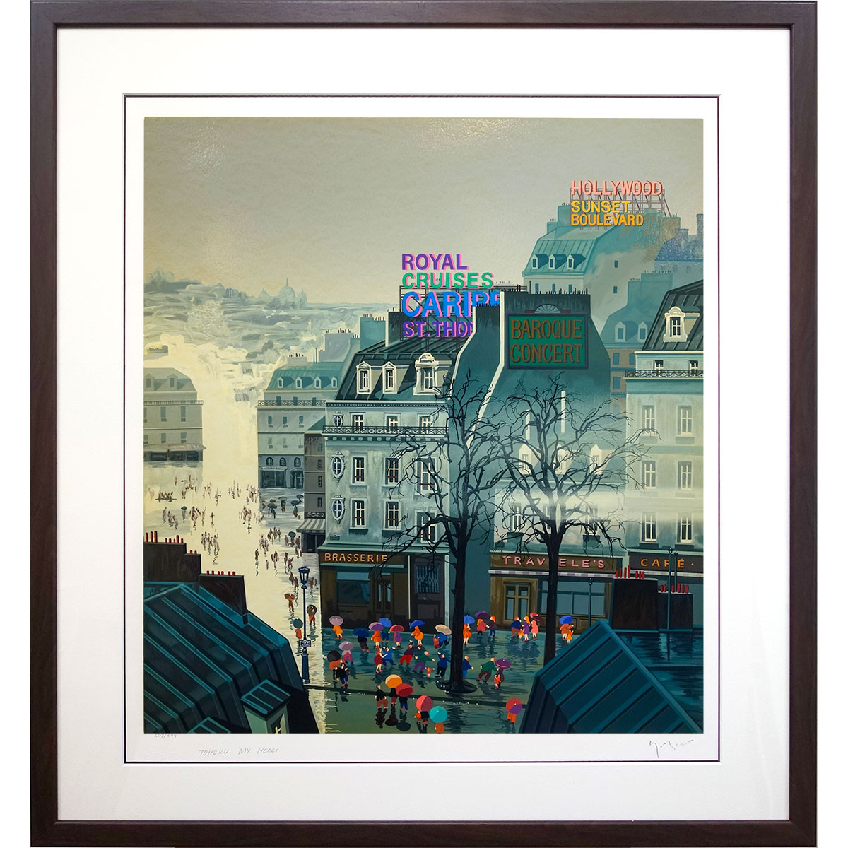 ヒロ・ヤマガタ 「サイドウォーク」 版画 シルクスクリーン 額入り 直筆サインあり 風景画 セリグラフ Hollywood 雨 街 傘 ヒロヤマガタ 山形博導 真作保証
