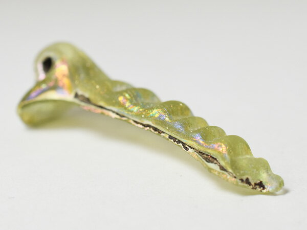 神秘的な銀化が見られる、セミクリアライトグリーンの古代ローマンガラス器の涙型残欠片ペンダントTOPです。両面に神秘的に輝く銀化が見られる美しい色のガラスです。孔が穿けてありますので、丸環等を入れていただくとお手持ちのチェーン等に通してすぐにペンダントとしてお使いいただけます。銀化の輝きは光の当たり方や、角度により様々な表情が楽しめます。 ■商品詳細■ サイズ:約48.0X28.5X6.0mm(縦X横X最大厚み) 孔の直径:約1.2mm 材質:ガラス 推測原産地:地中海地域 推測製作年代:前2~2世紀 ◆便利なネックレス製作3点キットはこちら ■ネックレス製作をご希望の方はこちら■ 蜻蛉玉,トンボ玉,とんぼ玉販売,アンティークビーズ販売神秘的な銀化!【2304】古代ローマングラスセミクリア涙型美銀化残欠片ペンダントヘッド5