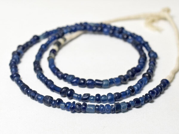 西アフリカ、マリ共和国の北部ジェンネ周辺で発掘された、ニラビーズと呼ばれる美しい色の半透明瑠璃色の小粒の古代ガラスビーズ一連です。1~4世紀ごろに交易品として、ローマ帝国領からこの地にもたらされたと思われるガラスビーズです。状態は良好です。個性的なアクセサリ製作用のパーツやコレクションにおススメです。粒のサイズ、形状、色にはやや個体差があります。 ■商品詳細■ 全長:約56.5cm(ビーズ部分のみ) 粒のサイズ:4.0X4.5mm(平均的な粒の長さX直径) 孔:0.8~1.2mm 材質:ガラス 推測原産地:地中海沿岸地域 推測製作年代:1~4世紀 蜻蛉玉,トンボ玉,とんぼ玉販売,アンティークビーズ販売超美色!【2510】マリ出土 半透明瑠璃色小粒ニラビーズ一連17