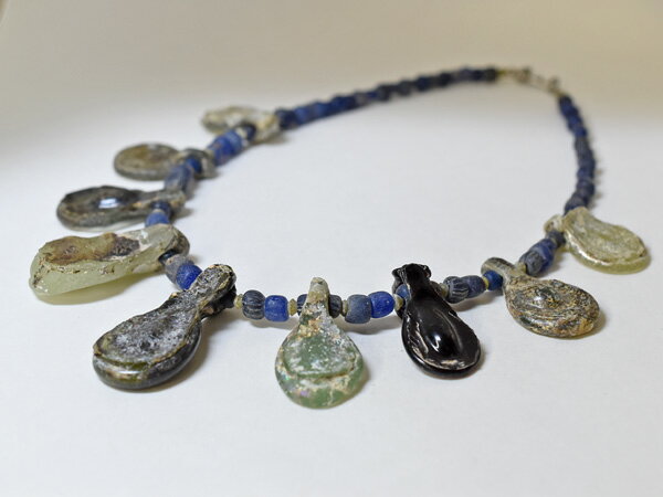 約2000年前の古代ローマ帝国時代頃に作られた、オリジナルのペンダントヘッドを9つ使ってデザインされた、ある意味豪華なネックレスです。小さな青い繋ぎのビーズは、インドパシフィック系の古いガラスビーズです。ペンダントヘッドには神秘的に輝く銀化現象が見られ、内1個の裏面には装飾が施されています。どれも補修の痕跡はありません。シルバー925の留金が付いており、ネックレスとして実用的にお使いいただけますが、全て古いガラスですので、慎重な取り扱いが必要です。 ■商品詳細■ 全長:約50cm(留金部分含む) 重量:約95g 材質:ガラス 素材の推測原産地:地中海沿岸地域 素材の推測製作年代:1~4世紀 蜻蛉玉,トンボ玉,とんぼ玉販売,アンティークビーズ販売 豪華!【2211】古代ローマングラスのペンダントヘッド9個付ネックレス