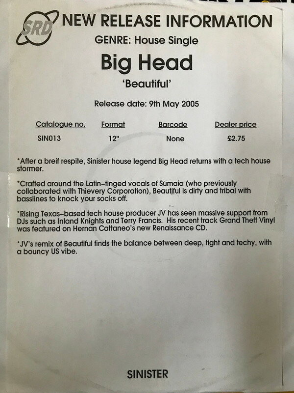 【中古】英12” Big Head Beautiful SIN013 Sinister Recordings /00250