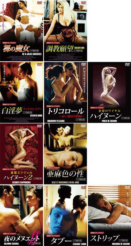 『官能のフレンチエロス DVD 10巻セットC 』 各巻 メーカー希望小売価格:1,800円+税 発売日:2015年5月29日 ジャンル:洋画・官能 【セット内訳】 裸の魔女 【ヘア無修正版】 品番:ANSK-62098 収録時間:88分 調教願望【ヘア無修正版】 品番:ANSK-62099 収録時間:87分 白淫夢 インモラル・ドアー 【ヘア無修正版】 品番:ANSK-62100 収録時間:89分 トリコロール〜赤い部屋の娼婦〜 【ヘア無修正版】 品番:ANSK-62101 収録時間:88分 ハイヌーン 【ヘア無修正版】 品番:ANSK-62102 収録時間:89分 ハイヌーン2 【ヘア無修正版】 品番:ANSK-62103 収録時間:90分 亜麻色の性 【ヘア無修正版】 品番:ANSK-62104 収録時間:89分 亜夜のメヌエット 【ヘア無修正版】 品番:ANSK-62105 収録時間:89分 タブー 【ヘア無修正版】 品番:ANSK-62106 収録時間:89分 ストリップ 【ヘア無修正版】 品番:ANSK-62107 収録時間:90分 【スペック】 映像:カラー 字幕:日本語 音声:オリジナルフランス語 発売元:株式会社アネック 販売元:株式会社アネック 『裸の魔女 【ヘア無修正版】 DVD』 原題:DE SI JOLIES SORCIERES 製作国:フランス 製作年:2000年 【スタッフ】 監督:エドワール・マルタン 脚本:パトリック・オブレ 【キャスト】 ジュリー・ペルコ ジェイド・イングリッド エドワン・クルージェ 【スペック】 ドルビーデジタル・ステレオ/4:3 コピーライト (C)SHOOT AGAIN / METROPOLE TELEVISION / 2000 【ストーリー】 モデル事務所を経営する3人のパリジェンヌ。見た目は美しいが、ごく普通のマドモアゼルたちはひとつの共通する秘密があった。彼女たちは不思議な魔術を操る魔女だった。その力を使い、夜な夜な男や、時には女たちをたぶらか し、自らの欲望を満たすカーマスートラの妖精たち。しかしそんな3人が、なぜかどうしても事務所の専属カメラマン・マルクだけはたぶらかす事ができなかった。 『調教願望【ヘア無修正版】 DVD』 原題:GOLDEN GIRL 製作国:フランス 製作年:1999年 【スタッフ】 監督:ガストン・ライアス 原作:マリーヌ・クリネ 【キャスト】 エマ リサ フィリップ・ヴィスコンティ 【スペック】 ドルビーデジタル・2chステレオ/L:B ビスタ・サイズ コピーライト (C)1999 SHOOT AGAIN / M6. ALL RIGHTS RESERVED. 【ストーリー】 株・投資信託を運用する金融ブローカーとして働くOLサビーヌ(エマ)は、生真面目で仕事も恋もうだつの上がらない日々を過ごしていた。ふとしたきっかけで、向かいに住むブロンド美女・モルガーヌ(リサ)と親しくなり、冴えないサビーヌは、彼女から美貌と肉体を利用してエグゼクティヴになる指南を受けることとなった。 『白淫夢 インモラル・ドアー 【ヘア無修正版】 DVD』 原題:SEVENTH DOOR 製作国:フランス 製作年:2000年 【スタッフ】 監督:エドワール・マルタン 脚本:マリネ・クリネット 【キャスト】 ルー・ベルガー アントイ・セイーン・オービン ベンルト・クレック 【スペック】 ドルビーデジタル・ステレオ/L:B ビスタ・サイズ コピーライト (C)SHOOT AGAIN / M6 depot legal 【ストーリー】 うら若きエンジニア、サロメとシリルの二人は、同僚が開発した最新映像技術のテストに参加する。ベッドに横たわり、リラックスした状態で機械を取り付けた彼女たちの前に予期しない世界が現れる。あられもない姿で男と交じり合う女。相手を過激なテクニックで玩び、自らの官能の源を突かせるその女の正体は彼女自身だった。 『トリコロール〜赤い部屋の娼婦〜 【ヘア無修正版】 DVD』 原題:UNKNOWN PLEASURE 製作国:フランス 製作年:2001年 【スタッフ】 監督:セリス・ドゥ・ペレ 脚本:ベアトリーチェ・シェブロー 【キャスト】 アントニン マチルダ・レニエ リサ・クロフォード 【スペック】 ドルビーデジタル・ステレオ/L:B ビスタ・サイズ コピーライト (C)2001 M6, ALL RIGHTS RESERVED. 【ストーリー】 それは好奇心からだった—。白いアパルトマンに越してきた若い夫婦、マルクとオドレイ。だが、マルクはある晩オドレイに拒絶されたことをきっかけに、道を挟んで建つ妖しいセックスショップに足を踏み入れる。その赤い覗き部屋で見た光景は、一瞬にして彼を虜にした。昼間、何気なく視線を交わした金髪美女が、今や目の前で淫らな獣と化していたのだ。 『ハイヌーン 【ヘア無修正版】 DVD』 原題:POKER DE CHARME 製作国:フランス 製作年:1998年 【スタッフ】 監督:ブルーノ・トロワジオ 脚本: ジャン=マルク・バスール/マルク・ルナール 【キャスト】 サンドリーヌ ジャン=ルイ・アンドリュー ロール・サンクレール 【スペック】 ドルビーデジタル・ステレオ/L:B/ コピーライト (C) 【ストーリー】 父の死後、グランド・ホテルの女支配人となったパメラは、最近ライバルのシェリダン・ホテルに客を取られているせいで、客が少なくなっていることに悩んでいた。だが、肝心の相談相手、ヴェルレーヌという男は女を引っ掛けることしか頭にない。たまりかねた彼女はシェリダン・ホテルにいる幼馴染のベネットを説得し、自分のホテルに迎える。その直後にシェリダン・ホテルは火災に見舞われ、常連客