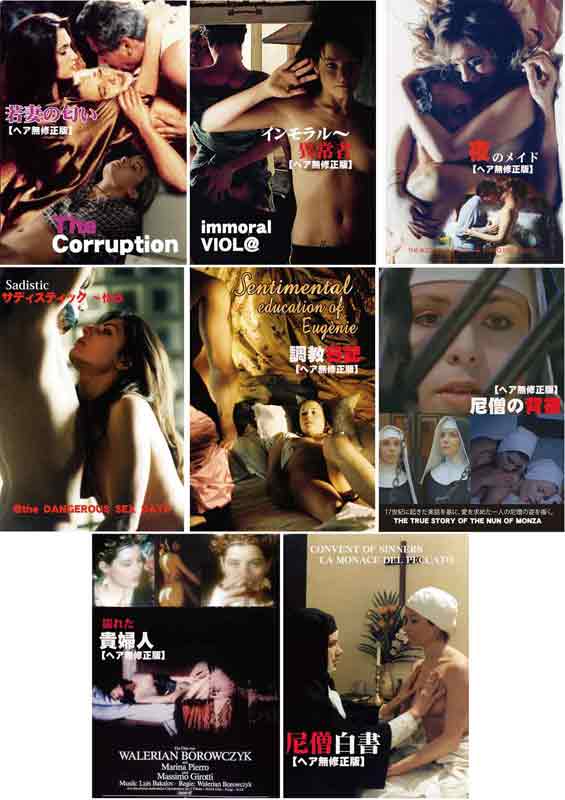 『禁断の官能映画シリーズ8巻セット』 【セット内訳】 「若妻の匂い 【ヘア無修正版】 DVD」 1986年イタリア/フランス 監督:サルヴァトーレ・サンペリ 主演:フローレンス・ゲラン 「インモラル〜異常者 【ヘア無修正版】 DVD」 1998年アメリカ/イタリア 監督:ドナテラ・マヨルカ 主演:ステファニア・ロッカ 「夜のメイド 【ヘア無修正版】 DVD」 2000年イタリア 監督:サルヴァトーレ・ピスチチェッリ 主演キャスト:ロベルト・ヘルリッカ 「サディスティック〜快感 DVD」 2001年イタリア 監督:マリア・マーティネリ 主演:ステファニア・ボナフェルド 「調教日記 【ヘア無修正版】 DVD」 2005年イタリア 監督:アウレリオ・グリマルディ 主演:サラ・サルティーニ 「尼僧の背徳 【ヘア無修正版】 DVD」 1980年イタリア 監督:ステファン・オブロースキー 主演:ゾーラ・ケロヴァ 「濡れた貴婦人 【ヘア無修正版】 DVD」 1984年イタリア/フランス 監督:ヴァレリアン・ボロヴツィク 主演:マリナ・ピエロ 「尼僧白書 【ヘア無修正版】 DVD」 1986年イタリア 監督:ダリオ・ドナッティ 主演:エヴァ・グリマルディ 「若妻の匂い 【ヘア無修正版】 DVD」 品番:ANSK-62042 メーカー希望小売価格:1,000円+税 収録時間:85分 原題:The Corruption / La Bonne 製作年:1986年 製作国:イタリア/フランス ジャンル:洋画・官能 【スタッフ】 監督:サルヴァトーレ・サンペリ 【キャスト】 フローレンス・ゲラン/カトリーヌ・ミケルソン/サイラス・エリアス他 【スペック】 映像:カラー 字幕:日本語 音声:英語(ステレオ)/イタリア語(モノラル) 画面サイズ 16:9(ビスタ・サイズ) 片面1層/MPEG2/リージョン 2( NTSC日本市場向)/ドルビーデジタル 【ストーリー&解説】 イタリアン・エロス界の名匠、サルヴァトーレ・サンペリの作品がニュープリント・デジタルマスター、ヘア無修正版で登場。メイドによって抑圧されていた性への衝動を解放されていく若妻を描く。<br<br>> 「インモラル〜異常者 【ヘア無修正版】 DVD」 品番:ANSK-62043 メーカー希望小売価格:1,000円+税 発売日:2012/8/24 収録時間:84分 原題:VIOL@ 製作年:1998年 製作国:アメリカ/イタリア ジャンル:洋画・官能 【スタッフ】 監督:ドナテラ・マヨルカ 【キャスト】 ステファニア・ロッカ/ロッサナ・モルタラ/ステファノ・ロッタ 他 【スペック】 映像:カラー 字幕:日本語 音声:英語 画面サイズ L:B(レターボックス) 仕様:片面 1層/ MPEG2/リージョン 2( NTSC日本市場向)/ドルビーデジタル 【ストーリー&解説】 インターネットで、不思議な魅力を持つ男性と知り合ったヴィオラ。彼女は、その男から送られてくる淫らな指示の数々に戸惑いながらも、次第に快感を得るようになる。 「夜のメイド 【ヘア無修正版】 DVD」 品番:ANSK-62044 メーカー希望小売価格:1,000円+税 発売日:2012/8/24 収録時間:96分 原題:THE BODY OF THE SOUL / IL CORPO DELL' ANIMA 製作国:イタリア 製作年:2000年 ジャンル:洋画・官能 【スタッフ】 監督:サルヴァトーレ・ピスチチェッリ 【キャスト】 ロベルト・ヘルリッカ/ラファエル・ボンゾ他 【スペック】 映像:カラー 字幕:日本語 音声:英語 画面サイズ L:B(レターボックス) 仕様:片面 1層/ MPEG2/リージョン 2( NTSC日本市場向)/ドルビーデジタル 【ストーリー&解説】 人気老作家のもとにやって来た若いメイドと、肉体関係を持つようになった作家は彼女に溺れて、いつしか主従関係が逆転していく …。 「サディスティック〜快感 DVD」 品番:ANSK-62045 メーカー希望小売価格:1,000円+税 発売日:2012/8/24 収録時間:97分 原題:AMORESTREMO 製作国:イタリア 製作年:2001年 ジャンル:洋画・官能 【スタッフ】 監督:マリア・マーティネリ 【キャスト】 ステファニア・ボナフェルド/ロッコ・シフレディ/ダヴィデ・デヴェヌート他 【スペック】 映像:カラー 字幕:日本語 音声:英語 画面サイズ 16:9(ビスタ・サイズ) 仕様:片面 1層/ MPEG2/リージョン 2( NTSC日本市場向)/ドルビーデジタル 【ストーリー&解説】 マリア・マーティネリ監督が贈る、出会い系サイトを通して知り合った男女を襲う事件を描いた官能サスペンス。主演はステファニア・ボナフェイド。 「調教日記 【ヘア無修正版】 DVD」 品番:ANSK-62046 メーカー希望小売価格:1,000円+税 発売日:2012/8/24 収録時間:87分 原題:SENTIMENTAL EDUCATION OF EUGENIE / L' EDUCAZIONE SENTIMENTALE DI EUGENIE 製作国:イタリア 製作年:2005年 ジャンル:洋画・官能 【スタッフ】 監督:アウレリオ・グリマルディ 【キャスト】 サラ・サルティーニ/アントネッラ・サルヴッチ/ヴァレリオ・タンボーネ他 【スペック】 映像:カラー 字幕:日本語 音声:イタリア語 画面サイズ L:B(レターボックス) 仕様:片面 1層/ MPEG2/リージョン 2( NTSC日本市場向)/ドルビーデジタル 【ストーリー&解説】 『肉屋』のアウレリオ・グリマルディが監督、脚本を手掛けたマルキ・ド・サド原作のエロスドラマ。サンタンジュ夫人は侯爵・ドルマンセと協力して、戒律の厳しい母親の下で育った 18歳の美処女・ユージェニーに肉の歓びを教えようと計画していた。 「尼僧の背徳 【ヘア無修正版】 DVD」 