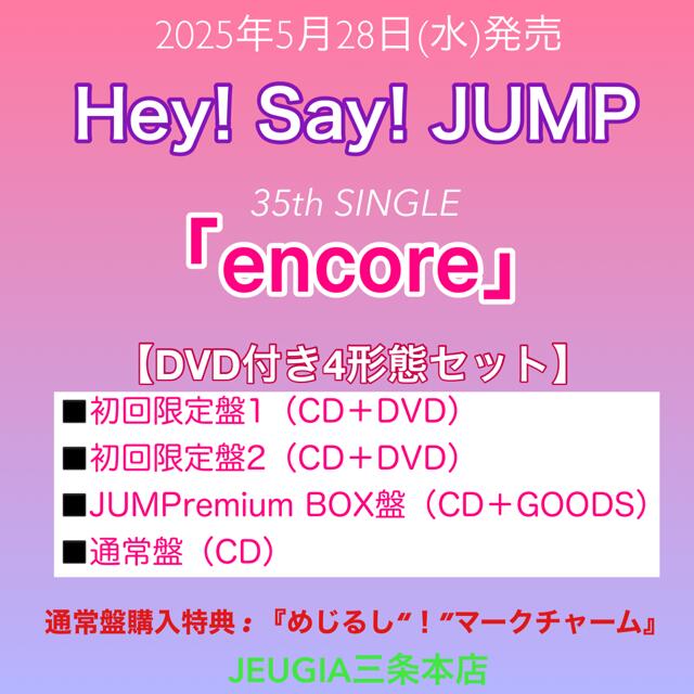 ※購入者特典:『めじるし“!”マークチャーム』付き!Hey! Say! JUMP New Single『encore』DVD付4形態セット初回限定盤1【CD+DVD】+初回限定盤2【CD+DVD】+JUMPremium BOX盤:完全生産限定盤【CD+GOODS】 +通常盤【CD】 [三条本店]