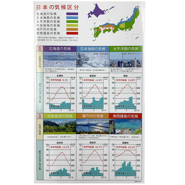 ・立体日本地図カレンダー用のシールです。カレンダー部分の上に貼り付けられます。 ・日本の6つの気候区分(北海道の気候、日本海側の気候、太平洋側の気候、中央高地の気候 瀬戸内の気候、南西諸島の気候)の特徴を表示。 ・日本の6つの気候区分の主要都市の平均気温と平均降水量をグラフ化。 ・※都市の気温と降水量は、気象庁の平年値のデータ(統計期間1991年~2020年)を利用しております。 【注意】シールはカレンダー部分の枠線と同サイズで作成しております。しかし、立体日本地図カレンダーは凹凸がある為、成型時にどうしても枠線等の線が歪んでしまいます。枠線内にシールを貼り付ける際、画像のようにぴったりと収まりませんので、予めご認識のほど宜しくお願いいたします。 製品仕様 商品名日本の気候区分シール 立体日本地図カレンダー用名称 日本の気候区分シール商品区分地図生産国日本製サイズ197mm × 332mm型番4547189909404商品内容商品説明:6つの気候区分(北海道の気候、日本海側の気候、太平洋側の気候、中央高地の気候 瀬戸内の気候、南西諸島の気候)の特徴と、平均気温と平均降水量をグラフ化したシールです。※都市の気温と降水量は、気象庁の平年値のデータ(統計期間1991年~2020年)を利用しております。 広告文責株式会社ソウマ(SOUMA CO.,LTD) TEL: 03-6659-4755メーカー株式会社ソウマ(SOUMA CO.,LTD) / 〒130-0026 東京都墨田区両国2-1-11 ※立体日本地図カレンダーはこちら ※立体日本地図カレンダー専用フレーム(別売り)もございます。 ※立体世界地図もございます。