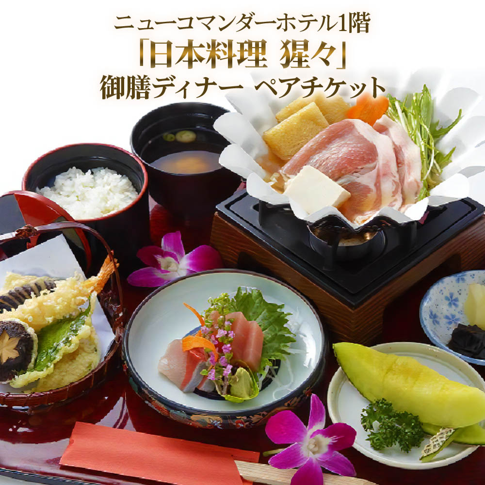 ニューコマンダーホテル「日本料理 猩々」御膳料理ディナー (ワンドリンク付き) ペアチケット 地域と共に、創業60年の老舗、ニューコマンダーホテル1階「日本料理 猩々」において提供する御膳料理ディナーのペアチケットです。 3つの御膳料理の中からお選びいただけます。(ワンドリンク付き) お申込み後、チケットを送付いたしますので、事前予約の上ご利用くださいませ。 【配送について】 入金確認後、2~3週間程度で発送いたします。 ※年末年始・ゴールデンウィーク・お盆期間などの長期休暇中は、お届けまでにお時間がかかる場合がございます。 ■使用期限 発行日から半年間 3つの御膳料理の中からお1人様1つずつお選びいただきます。 ◆牛肉陶板御膳(ワンドリンク付) その日最良の仕入れにて国産和牛を厳選。王道のロース肉をお好きな焼き加減でお召し上がりください。 《内容》 和牛陶板焼き、お刺身、天婦羅盛り合わせ、・おばんざい5種盛り、ご飯、お味噌汁、漬け物、ワンドリンク ◆握り寿司御膳(ワンドリンク付) 新鮮なネタ自慢の握り寿司に一人鍋、天婦羅がついた豪華でお得な御膳です。 《内容》 握り寿司6種盛り、豚ロース肉とうどん鍋、天婦羅盛り合わせ、お刺身、おばんざい5種盛り、ワンドリンク ◆牛すき鍋御膳(ワンドリンク付) 見事なサシが入った国産和牛を一人鍋にてお楽しみください。特製の割下との相性抜群。感激の美味しさをしっかり味わえるボリュームたっぷりな御膳です。 《内容》 すき焼き鍋、お刺身、天婦羅盛り合わせ、おばんざい5種盛り、ご飯、お味噌汁、漬け物、ワンドリンク ■提供事業者 株式会社ニューコマンダーホテル
