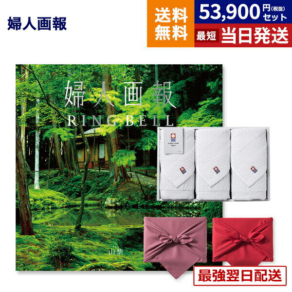 婦人画報 カタログギフト 〔山紫(さんし)コース〕+今治 綾 フェイスタオル3枚セット 【風呂敷包み】 内祝い お祝い 新築 出産 結婚式 快気祝い 引き出物 香典返し 満中陰志 ギフトカタログ プレゼント 女性 おしゃれ 結婚祝い カタログ 年配 5万円コース 送料無料