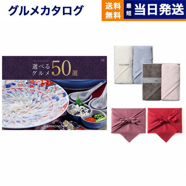 100%国産にこだわった、人気の1秒タオル「ホットマンカラー」 使い勝手のいいハンドタオルとのオリジナルセットです。選べるグルメ50選が選ばれる3つの理由多くのお客様が選んだ人気の高い商品を掲載した厳選グルメギフトこれまでの出荷実績をもとに人気の高い商品だけを50品掲載した厳選グルメカタログギフトです。手土産にもオススメなコンパクトサイズ手土産やお土産で気軽に贈れるようにカタログの大きさをコンパクトにしました。(化粧箱サイズ約22.5×17×1.5)予算に合わせやすいジャストプライスジャストプライスなのでお返しで贈る際や法人ギフトでの贈り物など予算に合わせやすい価格設定になっております。Hotman(ホットマン) ホットマンカラー ハンドタオルホットマンは絹織物製造業として明治元年(1868年)に東京・青梅の地に創業いたしました。細い糸を密度濃く丁寧に織り上げる絹織物特有の高度な技術と、秩父山系の伏流水を十分に使った染色技術を、140年余り大切に引き継ぎ、今に息づいています。「創造」の精神を原点に、革新を重ねながら誠実に丁寧にものづくりに取り組み、「本物だけをお客様にお届けする」という想いを商品に込めています。吸水性抜群の「1秒タオル※」「1秒タオル」とは、タオルを1cm角に切り取った試験片を水に浮かべた時、1秒以内に沈み始めるタオルのことです。吸水性抜群の1秒タオルは押し当てるだけで瞬時に水分を吸収してくれます。お風呂上りの敏感なお肌や髪、赤ちゃんにもやさしく快適にお使いいただけます。1秒タオルの認定は、ホットマン株式会社が独自の規定で行っております。 ※商標登録済京都・風呂敷京風呂敷の伝統的な作り方を守りつつ、様々な生地、染法を用いたメイドイン京都の風呂敷をお届けします。紬織の両面染風呂敷は、物を包んだときに結び目から裏の色が見えるのが特徴で、広げたときには裏の色が主役となります。隠れたお洒落をお楽しみ下さい。両面無地の風呂敷は、改まったご挨拶から日常使いのご進物、慶弔事など幅広くお使いいただけます。しわになりにくく、お洗濯もでき、生地には適度にハリがあり、結びやすく 使い勝手のよい風呂敷です。こちらは無料にてお手持ち用の手提げ紙袋をご用意しております。ご希望の際は『紙袋あり』をご選択ください。※紙袋にHotman(ホットマン)のロゴは入っておりません。また、弊社で販売しております紙袋とは仕様が異なります。■仕様・セット内容1:選べるグルメ50選 GBコース/ページ数:38ページ 掲載点数:50点・セット内容2:ハンドタオル(約38×86cm)×2枚・タオル製造:日本製・タオル素材:パイル地/綿100%カタログの表紙・内容につきまして、一部内容や表紙が予告なく変わる場合がございます。あらかじめご了承ください。カタログのお好きな商品を1点お選びいただけます。表示価格にはシステム料が含まれています。包装形態につきましてこちらの商品は包装紙をご選択頂きますと、カタログのみをお包みさせて頂いております。カタログギフトの上に箸を乗せ二段にし、風呂敷にてお包みさせていただいております。なお、「内のし」をご選択頂きますと、お熨斗を包装の内側にお掛けさせて頂きます。また、有料アレンジが承れない商品となっております。あらかじめご了承ください。◆◇風呂敷につきまして◇◆風呂敷のデザインが画像と異なる場合がございます。あらかじめご了承くださいませ。タオル製品、衣類、化粧品の交換・返品につきまして、原則として一度も使用していない状態であり出荷と同様の状態であること、タグが納品の状態のまま残っている場合のみ承っております。商品タグ、ラベル、リボン等がほどかれている、もしくは切り離されてる場合、ギフトボックスより取り出された場合、1度ご使用になられた場合、お客様のもとでキズや汚れが生じた場合、セット品の1部のみの交換・返品は承っておりません。あらかじめご了承下さいませ。CONCENTのギフトを販売促進やキャンペーンでご利用いただけます。広告代理店・プロモーションのご担当者様へ「記念品、景品、販促、ノベルティ」などさまざまな用途でご利用いただいております。