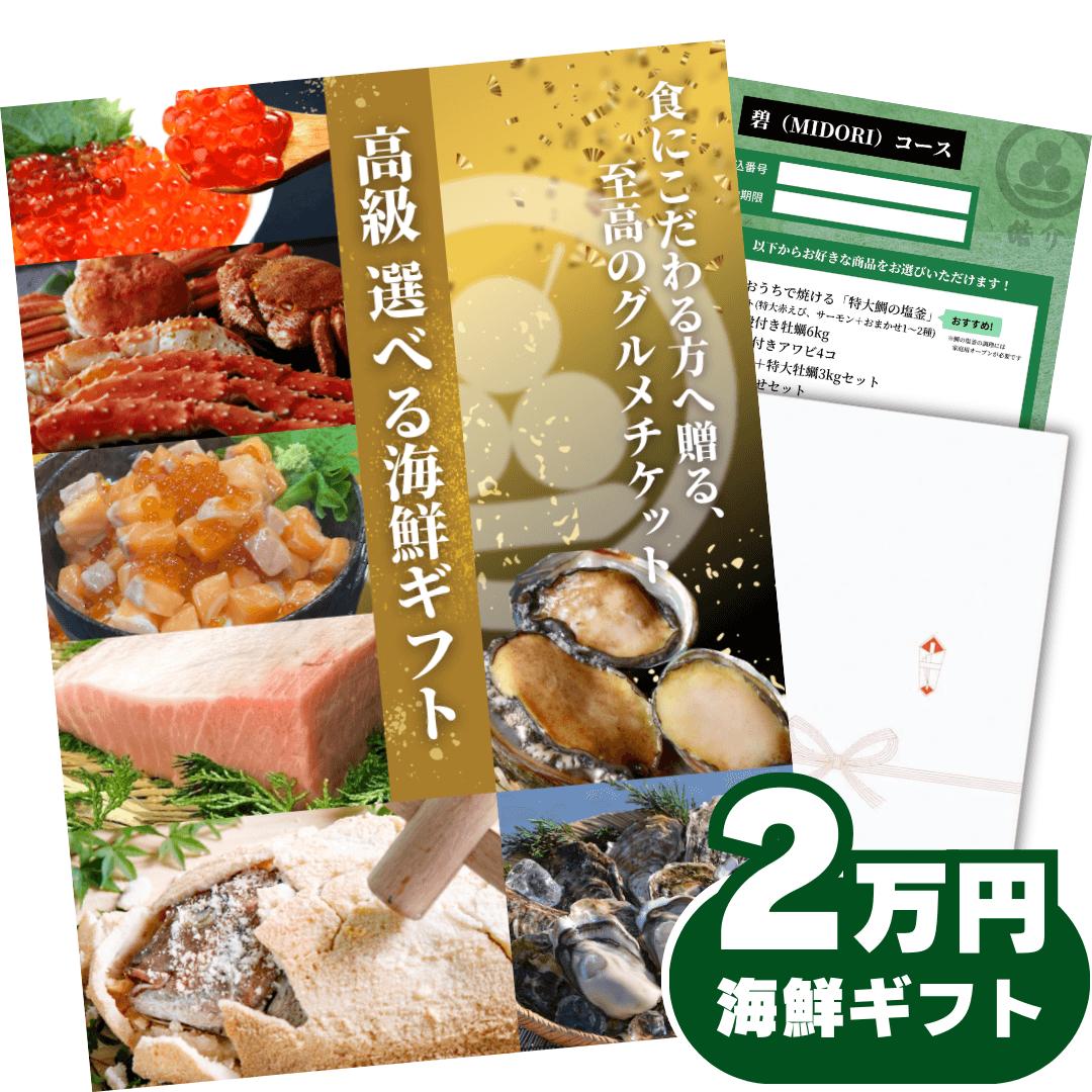 【ギフト】高級海鮮チケット2万円コース・グルメカタログギフト(選べる詰め合わせセット)内祝い お返し お祝い お礼 結婚祝い 誕生日 プレゼント ご祝儀 20000円 二万 送料無料 国産 北海道 出産祝い 結婚内祝い【お歳暮 熨斗対応】 プロ厳選の高級海鮮一万円分を、お祝いやお礼、内祝いの贈り物に!食にこだわる方にこそ届けたい、特選グルメカタログギフトです!サーモン、牡蠣、鮑など5つのコースから選べます。 【グルメな人も大満足!】「食にこだわりのある方」にこそ味わっていただきたい、こだわりの海鮮を詰め合わせました!足が早い海鮮だからこそ、もらった方がご在宅のご都合に合わせて注文していただけるのが便利です。【とれたての味を再現!】冷凍方法にもこだわりあり!!海鮮が一番美味しくなる特殊技術「CAS冷凍」を採用しています。細胞が活きたまま凍結される、夢の技術です!(数々のTV番組でも紹介されています!)■ギフトセット内容■・海鮮セット引換券「碧コース」(コースの説明書付き)・申込用ハガキ(切手付)・熨斗封筒(ギフト用の包装)■交換商品内容■・季節の最高級冷凍海鮮20,000円分(約5種類のコースからお好きな海鮮を選べます)■ご利用の流れ■1) 「お届け先」へギフトセットをお送りします2) 受け取られた方は、後日、PCまたはスマホの専用フォーム、ハガキ、FAXなどお好きな方法で商品をお申込みいただきます。3) 約7日〜10日で景品をお届けいたします。日付指定も可能です。※封筒などのデザイン、海鮮の選択肢は、季節によって変更される可能性がございます。【賞味期限】海鮮の賞味期限は、冷凍庫保存で約2ヶ月間です。(ご家庭用の冷凍庫は開け閉めによる温度変化が激しいため、なるべく早めにお召し上がりください。)【その他のコース】■ギフト用■(熨斗に対応)・5,000円コース・10,000円コース・15,000円コース・20,000円コース(本商品)・25,000円コース・30,000円コース・50,000円コース・100,000円コース■イベント景品用■(パネル+幹事用の説明書付き)※カタログ内容はギフト用と同じです・5,000円コース・10,000円コース・15,000円コース・20,000円コース・25,000円コース・30,000円コース・50,000円コース・100,000円コース※どのコースにも、明細書などの値段がわかるもの(実際の購入価格やポイント倍率が書かれたもの)は一切同封いたしません。安心して、贈りものにもご利用ください!※領収書は、楽天の注文履歴からダウンロードをお願いいたします。 12