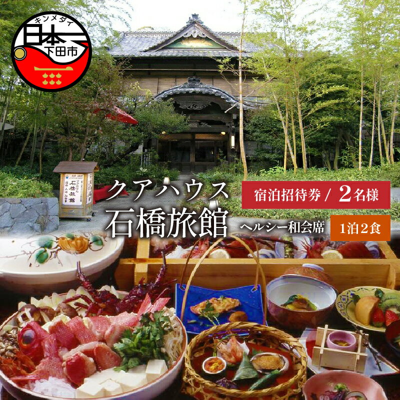 ドイツ・オーストリア発祥の美容と健康のヘルスケアシステムを採用しています。トレーニングルーム併設・ギャラリー・茶室などを備える心と身体の癒し空間です。 ・玄関(夜):明治の面影を留めている重厚な唐破風御殿造りの玄関 ・ロビー:八十八面総漆格天井に漆喰花彫刻の典雅なロビー ・クアギャラリ-:和のしつらいに洋のエッセンス。クアギャラリ-「美しく青きドナウ」 ・露天風呂:夢のある造形空間のアートな庭園露天風呂「月あかり」 ◇従業員の声◇ 清流と緑に囲まれた風情と静けさは喧騒を逃れた旅人の心を癒してくれます。 ※注意事項※ ●ご利用時は直接、旅館へお電話にて当利用券を利用する旨お伝えし、ご予約下さい。 (お申込み後にお届けする案内書をご確認いただき、ご予約をお願いいたします。ネット予約不可) ●GW・お盆・年末年始等、ご利用になれない期間がございます。 商品説明 名称 ヘルシー和会席(宿泊券ペア1泊2食) 内容 宿泊御招待券2名様(1泊夕・朝2食付) 有効期限 発行日より1年間 提供元 クアハウス石橋旅館 (住所:静岡県下田市蓮台寺185-1) 注意事項/その他 ※お申込み後、順次発送 ※本券については到着後すぐに内容物を確認いただきますようお願いいたします。 ※本券をお受け取り後、宿泊先にご予約のうえご利用ください。またその際、本券に記載の予約番号をお伝えください。 (お申込み後にお届けする案内書をご確認いただき、ご予約をお願いいたします。ネット予約不可) ※ご寄附後のキャンセル、返礼品の変更・返品・寄附者様のご都合により返礼品を受け取らなかった場合の再発行はいたしかねます。あらかじめご了承ください。 ※本券は破損、紛失、盗難、有効期限切れなどにおける再発行はお受けしかねます。 ※本券は金券ではありません。換金や転売は禁止いたします。 ※ご使用の際には本券をご持参ください。ご持参いただけない場合、現地にて規定の料金をご請求させていただきます。 ※画像はイメージです。