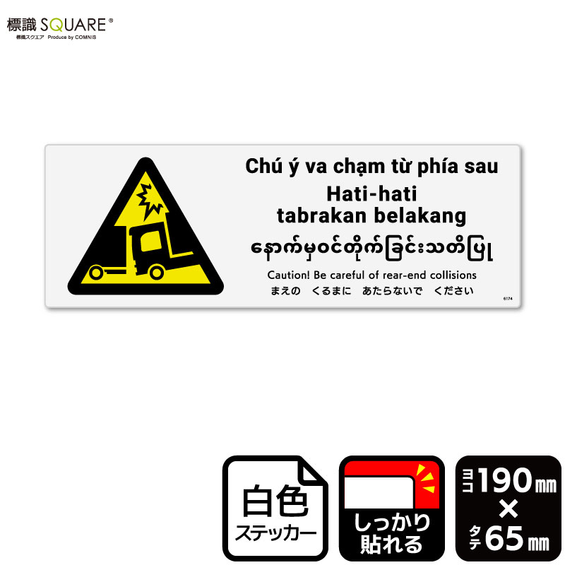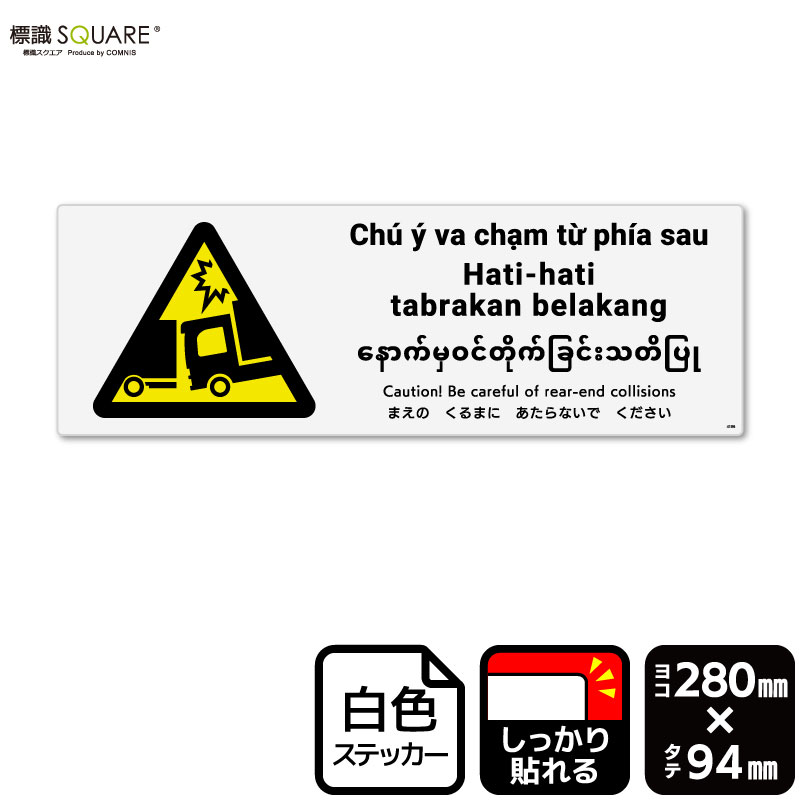 <ホワイトフィルムステッカー(強粘着) 使用上のご注意> ●特に直射日光や風雨等に晒される場所では、長期にわたるご使用により印刷部が退色したりステッカーが変色する可能性がありますので、定期的な取替えをおすすめします。 ●溶剤類(アセトン・シンナー・ベンジン等)は表面を傷めますので使用しないでください。 ●極端な低温・高温の場所でのご使用はお避けください。 ●強粘着糊を使用していますので、はがす際に被着体を傷めるおそれがあります。 ●被着体によっては接着しにくい場合があります(皮革・複雑な曲面・凹凸面など)。■関連ワード:追突注意 追突事故 後方衝突 前方注意 外国人労働者トラック 駐車場 積み下ろし作業 現場 工場 労災 労働災害 事故防止 安全対策 標識 標示 表示 サイン 掲示 ステッカー ラベル シール