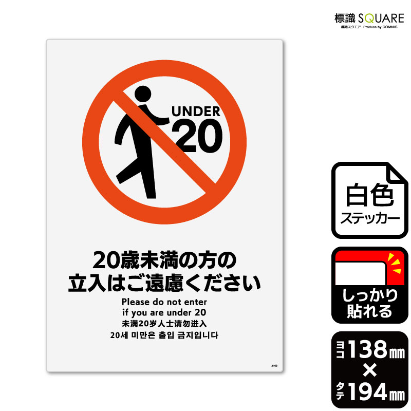 標識SQUARE 「20歳未満の方の立入はご遠慮ください」 CFK3103 【ホワイトフィルムステッカー 強粘着】タテ型 横138mm×縦194mm