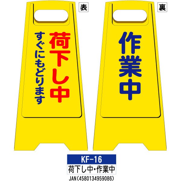 フロアスタンド 両面印刷 KF-16:表/荷下ろし中・裏/作業中 1枚 W300×H600mm 標識 樹脂スタンド看板 サインスタンド 作業中 立て看板 安全保安用品