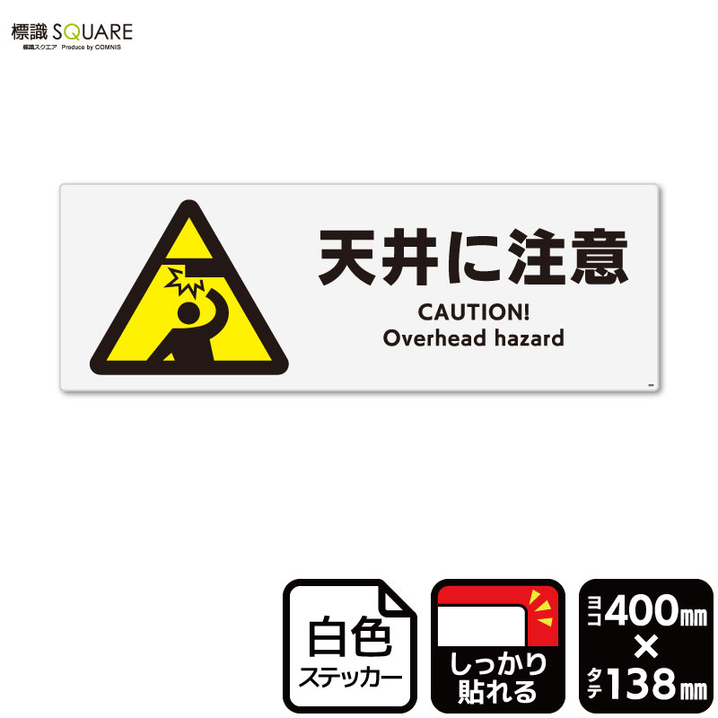 標識SQUARE 「天井に注意」 CFK2025 【ホワイトフィルムステッカー 強粘着】ヨコ型 横400mm×縦138mm