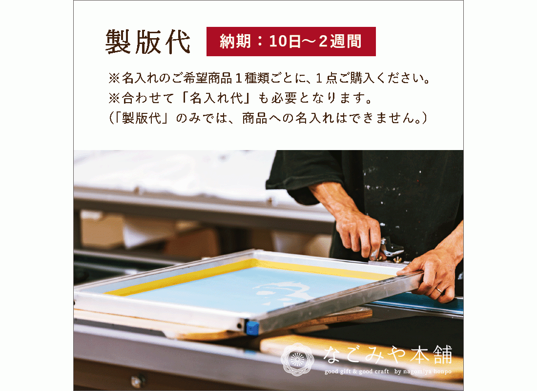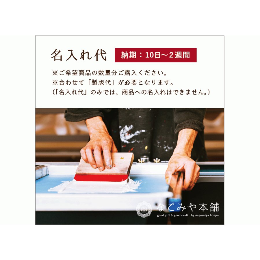 名入れ対応可能商品※であれば、大切な人への「メッセージ」、自分や相手の「名前」、「日付」などを入れることによって相手に感謝や大切に思う気持ちが伝えられるこでしょう。 スクリーン印刷を使用しあなただけのオリジナル商品に仕上げることができます。 商品への名入れをご希望の方はこちらの<オリジナル名入れ代>をご購入ください。 ※名入れ対応可能商品は、各商品ページに記載あります<本商品は名入れ可能商品です>と記載がある商品にて対応可能でございます。 合わせて、<オリジナル名入れ製版代>をご購入ください。 関連イベント 母の日 敬老の日 クリスマス 父の日 誕生日 お年賀 お中元 粗品 景品 引き出物 引出物 新築祝 結婚 記念 お返し お歳暮 出産祝 出産内祝 内祝 快気祝 結婚 全快祝 快気内祝 引越し 御祝 贈り物 入学 お祝 御祝 成人祝 成人内祝 敬老の日 引き出物 引越し ご挨拶 初節句 就職祝 就職内祝 退職祝 敬老祝 古希 米寿 喜寿