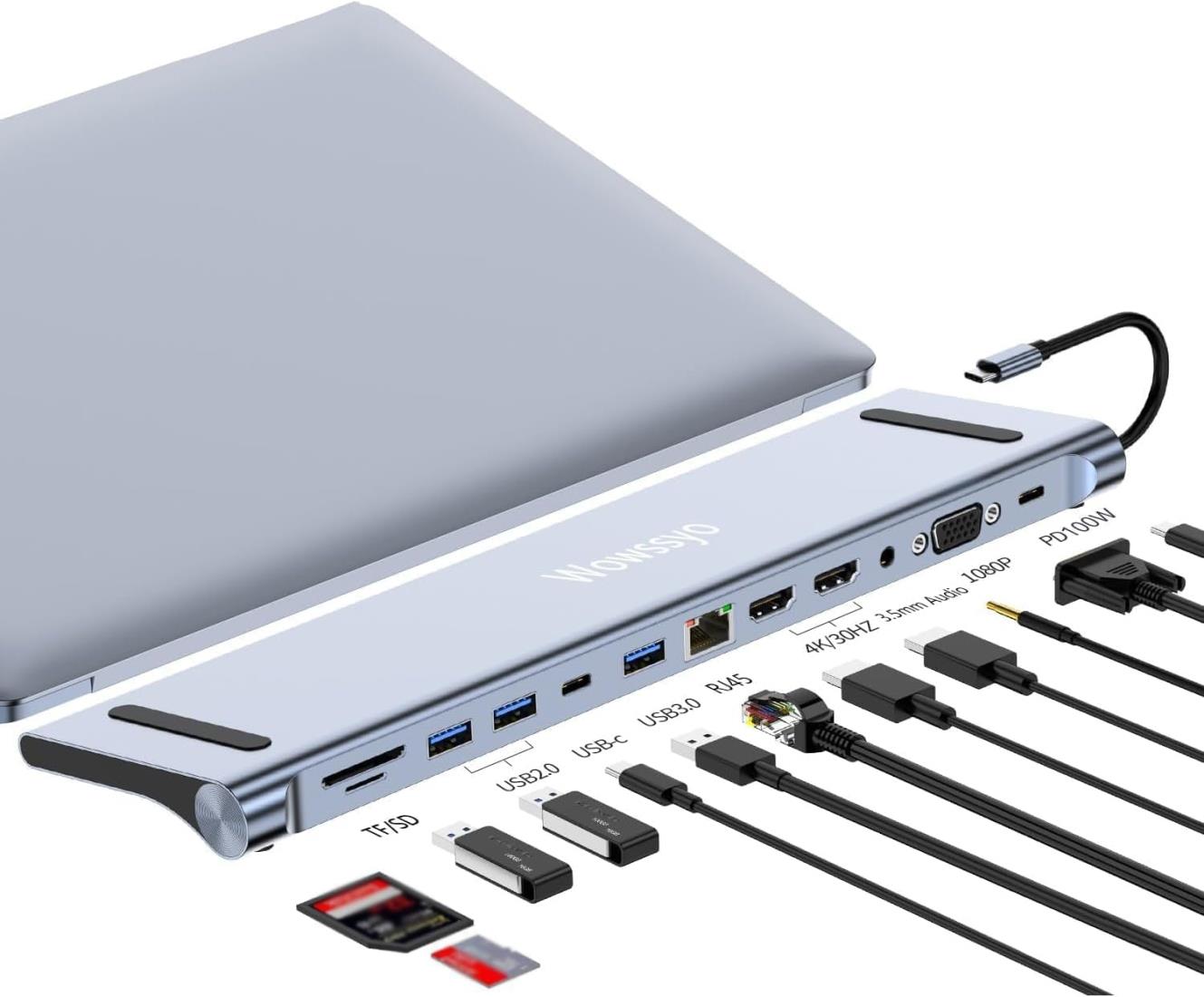 Wowssyo 12-in-1扩展坞 USB C集线器、3显示器用USB C适配器 2 HDMI 4K、VGA、USB 3.0 /2.0、USB C数据端口、SD/TF读卡器、以太网、PD 100W、3.5mm音频 MacBook Pro/Air和Windows用
