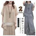 レディース 綿麻 半袖 トップス ワイドパンツ 上下セット 春 夏 セットアップ ゆったり 快適 涼しい きれいめ カジュアル ロングパンツ