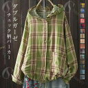 ガーゼ パーカー レディース 長袖 ダブルガーゼ パーカー チェック柄 ボタン ボタンパーカー ガーゼパーカー ガーゼカーディガン 前開き フード付き トップス 羽織 ジャケット カジュアル ナチュラル 通勤 体型カバー ゆったり 綿100% ガーゼコットン シンプル 春 秋 冬