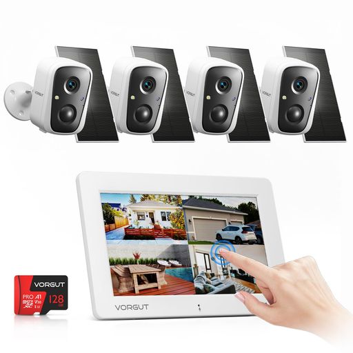 VORGUT防犯カメラ屋外ソーラーモニター付き4台セット400万画素2.4G&5GWiFi対応防犯カメラワイヤレス屋外電源不要監視カメラ屋外ソーラー7インチのタッチパネルモニター128GBカード付PIR検知双…