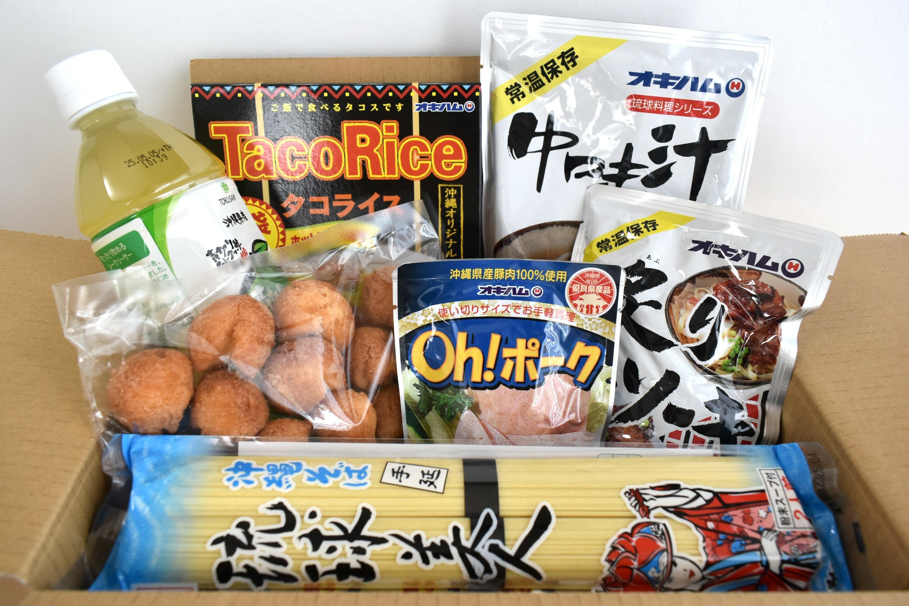沖縄グルメの定番や押さえておきたい料理が味わえる、沖縄のまーさむん(おいしいもの)を詰め込んだ「まーさむんセット」第3弾! ご自身用としても、ギフト用としてもおすすめのお得なセットです。 【セット内容】 ・サン食品 沖縄そば乾麺 琉球美人(2人前 袋だし付き) ・オキハム 炙り軟骨ソーキ 160g ・オキハム オキハム Oh!ポーク(小) 85g 1袋 ・オキハム タコライス(2袋入り) ・オキハム 中味汁 350g ・りゅうほう サーターアンダギー 18個入り ・沖縄特産販売 青切りシークワーサーペットボトル 500ml ■沖縄そばについて 沖縄グルメの定番の一つ、沖縄そば。 甘辛く煮たソーキ(豚の骨付きあばら肉)や三枚肉(豚バラ肉)、かまぼこ、ねぎなどをのせた沖縄では頻繁に食べられている沖縄そばは、そばに蕎麦粉が使われておらず、小麦粉100%で作られています。 そのため、沖縄そばは、『そば』とは認められず、沖縄生麺協同組合等の交渉により1978年10月17日に特殊名称としての使用が許可されました。 今日では、10月17日は“沖縄そばの日”として、様々なイベントが開催されています。 そんな沖縄県民に愛されている沖縄そばの中から、「ソーキそば」が作れる食材をセットに加えました。 【お召し上がり方法】 1.沸騰したたっぷりのお湯にめんを入れ、約6分ゆでてください。 2.めんがゆであがる前に、粉末スープを丼ぶりにあけ、熱湯約250cc(コップ1杯半)を注ぎよく混ぜてください。 3.ゆであがっためんを湯切りし2.の丼ぶりに入れ、お好みにより肉、かまぼこ、ねぎ、紅しょうが等を盛り付けてお召し上がり下さい。 炙り軟骨ソーキを加えると食べ応えのある一品になります! ■オキハム Oh!ポーク(小) について 沖縄ではポークランチョンミートのことを単に「ポーク」と呼びます。 オキハム Oh!ポーク(小) は沖縄県産の豚肉を100%使用し、沖縄の食卓に合ったポークランチョンミートに仕上げています。チャンプルーはもちろん、コロッケなどの具材として、カレーやシチューなど幅広くお使いいただけます。 もっともポークを食べる沖縄県が作ったポークランチョンミートをぜひご賞味ください。 【お召し上がり方法】 袋を開けてそのままお召し上がりいただけます。 調理に使用する場合は、袋の上から軽くほぐして具材と一緒にフライパンへ。 ※電子レンジでの使用の際は、必ず他の容器に移し変えて温めてください。 ■タコライスについて 米軍基地のある沖縄県金武町で生まれたタコライスは、ご飯の上にタコスミートを載せたスタイル。 ピリ辛のタコスミートにお好みでチーズやレタス、トマトを載せて食べれば本場沖縄の味が楽しめます。 【お召し上がり方法】 1.タコスミートを袋のまま、熱湯で5分程度温めてください。 2.タコスミートを温かいご飯の上にかけます。 3.お好みで、刻んだレタス、トマト、チーズをのせてください。 4.ホットソースをかけますと、さらに辛味がきいて美味しく頂けます。 ■中味汁について 沖縄のお祝いにかかせない「中味汁」は、豚モツを柔らかくじっくり煮込んだお吸い物です。子供から大人まで人気のあるオキハム特製の深い味わいの中味汁です。 【お召し上がり方法】 袋のままでお湯の中に入れ、5~6分間加熱して、お召上がりください。 お好みで、しょうがなどをお入れください。 ■サーターアンダギーについて サーターアンダギーとは、琉球王朝時代に中国から伝わった揚げ菓子です。 外側はサクっとし、中はしっとり。 そんなサーターアンダギーが食べやすい一口サイズになりました。(直径約3cm) お得な18個入りです。 【お召し上がり方法】 開封してそのままお召し上がりください。 ■青切りシークワーサーペットボトルについて 沖縄県産のシークヮーサーを使い、のど越し爽やかなドリンクタイプに仕上げました。 【お召し上がり方法】 希釈せずそのままお召し上がりください。 ・沖縄そば乾麺 琉球美人 原材料 [めん]小麦粉、食塩、かんすい、くちなし色素、綿実油[スープ]食塩、ぶどう糖、蓄肉エキス、ラード、魚介エキス、香辛料、調味料(アミノ酸等)、(原材料の一部に豚肉、大豆、乳成分、魚介類含む) 内容量 200g(90g×2) 賞味期限 製造日より9ヶ月 ・炙り軟骨ソーキ 160g 原材料 豚バラ肉(軟骨つき)、しょうゆ、砂糖、酒、調味料(アミノ酸)、(原材料の一部に小麦、大豆を含む) 内容量 160g 賞味期限 製造日より未開封の状態で1年 ・オキハム Oh!ポーク(小) 85g 原材料 豚肉、豚脂肪、コーンスターチ(遺伝子組換え不分別)、大豆蛋白、食塩、香辛料、ポークエキス、カゼインNa、リン酸塩(Na)、調味料(アミノ酸等)、酸化防止剤(ビタミンC)、コチニール色素、発色剤(亜硝酸Na)、(原材料の一部に乳成分、豚肉、大豆を含む) 内容量 85g 賞味期限 製造日より1年(未開封) ・タコライス(2袋入り) 原材料 [タコスミート]食肉(牛肉、豚肉)、野菜(たまねぎ、にんにく)、しょうゆ、香辛料、砂糖、顆粒だし、食塩、調味料(アミノ酸等)、(原材料の一部に乳、小麦を含む) [ホットソ