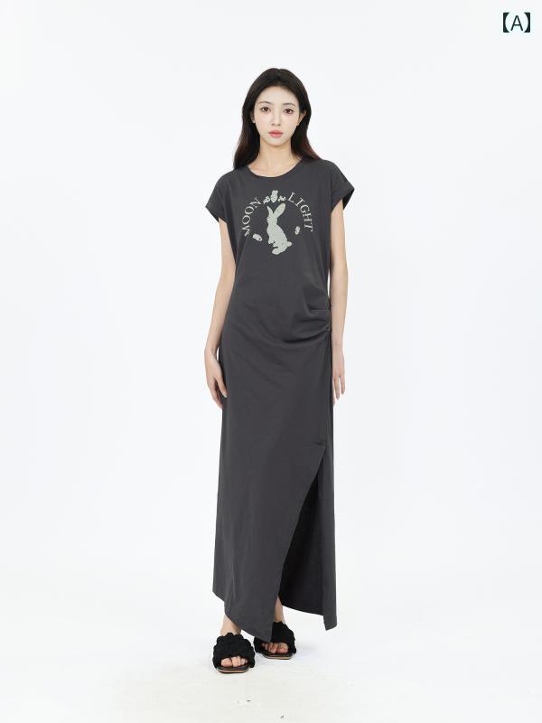 レディース 夏 ワンピース ゆったり ワンピ 快適 体型カバー レトロ アメリカン レター ウサギ プリント 半袖 ウエスト T シャツ スリットドレス 女性