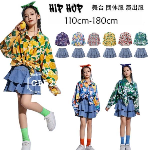ダンス衣装 女の子 ダンスウェア 舞台 団体服 演出服 キッズ K-pop 原宿系 ドラム ショー クラス活動 韓国 人気 上下セット 長袖 シャツ デニム ティアードスカート ステージ衣装 jazz 花柄シャツ+デニムスカート おしゃれ セットアップ