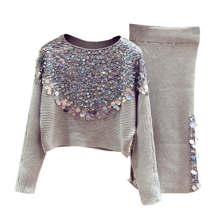 【ブラックフライデー ポイント2倍×クーポン有】ビジュー カットソー スカート セットアップ グレー スパンコール スリット タイト ニット