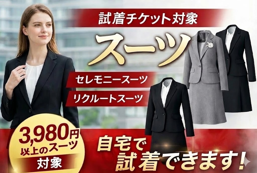 ネットでスーツを購入する際 「サイズが合うか不安」「実際のシルエットを見て決めたい」 そんなお声にお応えして **レディーススーツ専用《試着チケット》**をご用意しました ご自宅で実際にご試着いただき、 ご納得いただいた商品をお選びください。 【チケット内容・料金】 ・ レディーススーツ 2着まで試着可能:800円(税込) ・ レディーススーツ 3着まで試着可能:1,000円(税込) ※本チケットはお支払いが カード決済のみ となります ※本チケットはスーツ商品のみ対象です ※1着あたり3,980円(税込)以上のスーツが対象となります ※1回のご注文につき、いずれか1点のみご購入ください ※本チケットの配送先は沖縄を除きます 【対象商品について】 本試着チケットは 当店で販売しているレディーススーツのうち 1着あたり3,980円(税込)以上の商品が対象となります ※ジャケット・パンツ・スカート等の単品商品 ブラウス・小物・アクセサリー類は対象外です ※3,980円未満の商品は試着チケット対象外となります 【ご利用方法】 (1)試着したい対象スーツ(3,980円以上)と一緒に、本試着チケットをカートに入れてご注文 (2)商品到着後、ご自宅でご試着(室内のみ) (3)ご購入される商品を決定 (4)商品到着から5日以内に ご不要な商品をご返送ください 【試着チケット代の取り扱いについて(重要)】 ご試着された商品をすべてご購入された場合 ・ 試着チケット代は 返金いたします 1点もご購入されない場合(全品返品の場合) ・ 通常の返品と同様の扱いとなり 試着チケット代は返金対象外となります ※返送時の送料はお客様ご負担となります。 【必ずご確認ください】 ・試着は室内のみでお願いいたします ・タグは外さず、付属品もすべてお戻しください ・香水・化粧・汚れ・シワ・においが付いた商品は返品不可 ・商品到着から5日を過ぎた場合は、ご購入扱いとなります 【ご注意事項】 ・本試着サービスはスーツのみ対象となります ・3,980円未満の商品は対象外となります ・対象外商品をご注文された場合、試着チケットは無効となり通常のご注文に変更となります (1cm)