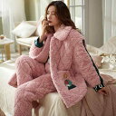 パジャマ レディース ルームウェア 上下セット もこもこフランネルフリース 極厚 裏起毛 中綿入り 保温 快適 長袖 長ズボン 前開き 襟付き 秋冬 おうち時間