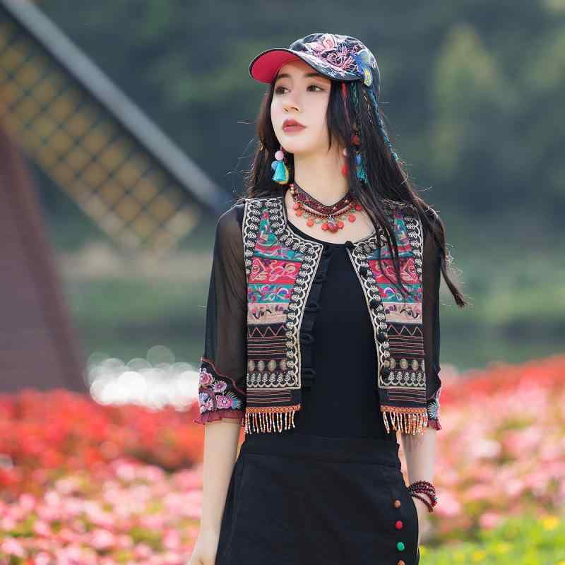 ベスト レディース ボヘミアン レトロ 民族風 精緻な刺繍 ビーズ装飾 配色切り替え ショート丈 スリムフィット シングルボタン ラウンドネック 綿麻 花柄 ブラック