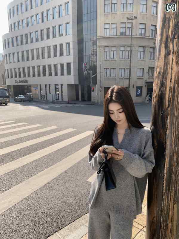 スーツ ツーピース レディース LilylikesLazy Flight Suit 100 % 羊毛 Vネック ポケット 付き セーター ウール パンツ
