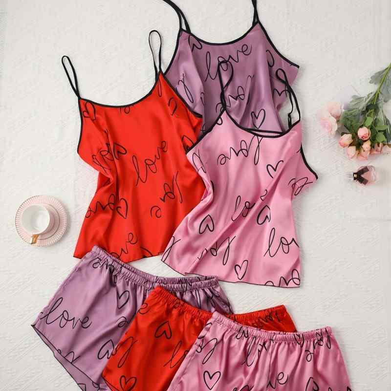 ルームウェア レディース 女性用 プラスサイズ 大きいサイズ パジャマ セットアップ スリーピースセット ラブプリント柄 キャミソール ノースリーブ ショートパンツ 薄手 接触冷感 通気性 快適 ゆったり リラックス ポリエステル サテン 春夏秋 部屋着