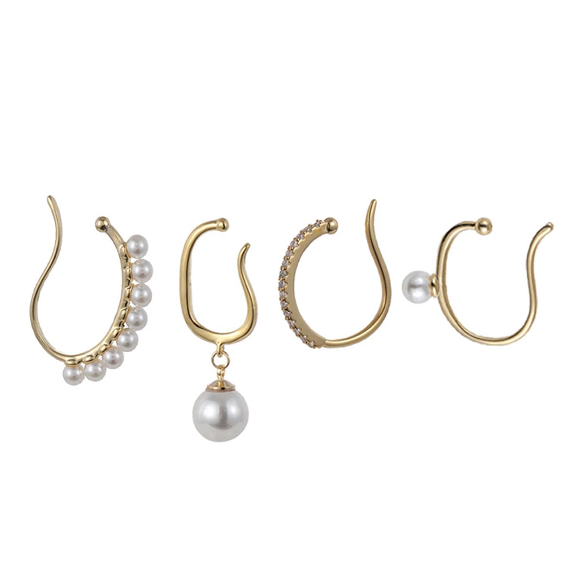 [ALOHAMONI] イヤーカフ フェイクピアス パール ゴールド ラインストーン 4点セット 大粒パール 小粒 8連パール 片耳 両耳 重ね付け 耳掛け 韓国 オルチャン