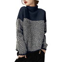 [NONELECEDOLE]ニットセーターレディースハイネックバイカラートップス長袖ストライプゆったり厚手暖かい着痩せ大人だるい風カジュアル通勤秋冬