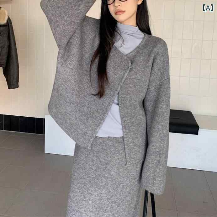 ニットセットアップ 長袖 きれいめ おしゃれ Kumikum ファッション スーツ 女性 グレー セーター コート 春の ウエスト ニット スカート 2点 セット