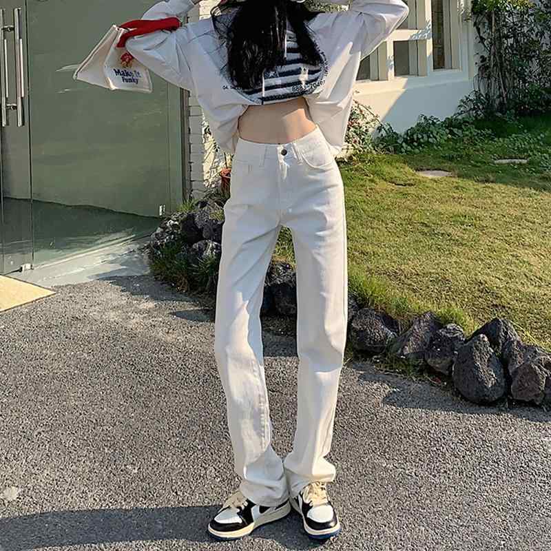 ファッション 服 オシャレ カワイイ シンプル 大カワイイ サイズ 婦服 ホワイト 韓国 スタイル ストレート ジーンズ スリム 伸縮性 ストレッチ ワイド レッグ ドレープ フロア レングス