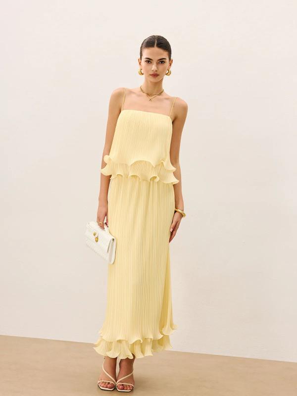・カテゴリ: チュニック・スタイル: エレガント、オフィス・柄: 無地・スカート丈: ロング丈・素材: ポリエステル・袖丈: ノースリーブ・カラー: ライトイエロー・サイズ: S、M、L、XL・特徴: プリーツ