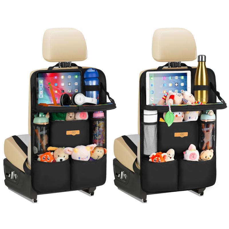 SURDOCA 車用バックシートオーガナイザー 子供·大人用折りたたみトレイ付き – 新モデル タッチ可能なタブレットポケット付きシート収納、ロードトリップ必需品 – ほとんどの車両に適合安定した折りたたみトレイ: 埋め込み木材ボードにより、食事、絵描き、さらにはノートパソコン用の頑丈な表面を提供。旅行中の子供から大人まで対応強化された耐久性: 厚手の600Dオックスフォード生地と強化ナイロン縫製で作られており、より強力な縫い目が優れた耐撕裂性と長期使用を透明なタッチ対応タブレットポケット: 2つの透明なタッチ対応タブレットホルダー、2つのメッシュボトルホルダー、本用ポケット、2つの広い下部ポケット(スナックやおもちゃ用)を備える省スペースで簡単清掃: 使用しないときはトレイが平らに折り畳め、防水表面は数秒で拭き取れる — ロードトリップや日常使用に最適ユニバーサルフィットと強化バックパネル: 調節可能なストラップと頑丈なバックパネルにより、ほとんどのカーシートに迅速な取り付けと確実なフィット感を確保