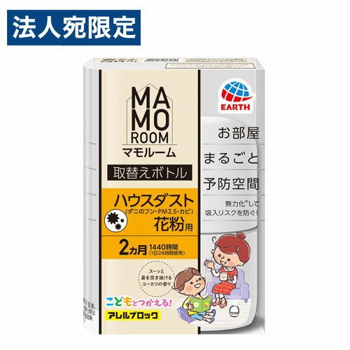 ハウスダストや花粉の浮遊・舞い散り防止に。※本製品はボトル(取替用)のみです。使用する場合は、別売りの器具(本体)をお買い求めください。スイッチを入れるだけで、成分が部屋中に広がって、アレルゲン(ハウスダスト・花粉)の吸入リスクを防ぎます。※マモルーム器具には、全てのマモルーム取替えボトルが使えます。目的に応じて使い分けることができます。■無力化して吸入リスクを防ぐ!(1)成分が部屋中に広がってハウスダストや花粉に付着します。(2)落下促進、床上の舞い散り防止により、ハウスダスト・花粉の吸入リスクを防ぎます。※無人の閉鎖空間で、模擬ハウスダスト・花粉を用いた評価により効果を確認しています。(メーカー試験)※本品は医薬品ではありません。※ハウスダスト(ダニのフン、PM2.5、カビ)・花粉の吸入を完全に防ぐものではありません。■子供部屋にも使えます。■スーッと鼻を突き抜けるユーカリの香り。【使用上の注意】●電源コードにキズ、亀裂等があったり、コードを動かすとランプが点滅する器具は、感電や発火の原因となり危険です。直ちにご使用を中止し、新しい器具と交換してください。●万一身体に異常が起きた場合や、液を誤って飲んだ場合は、本品を持参し、直ちに医師の診療を受ける。●ボトルの芯には薬液がついているので直接手を触れない。万一、皮膚に薬液がついた場合は、石けんを用いてよく洗う。●閉め切った部屋や狭い部屋で使用する場合は、時々注意して部屋の換気をする。体質や体調によっては頭痛、のどの痛み、不快感などの原因となります。●アレルギー体質の人は使用に注意する。●器具に針金やピン等を差し込んだり、ぬれた手で器具に触れたりしない。また器具やボトルに水・油等の液体をかけない。感電や故障の原因となります。●使用中、器具上部や蒸散口は熱くなるので、手で触れたり、中に指を入れたりしない。やけどの原因となるおそれがあります。●使用中及び使用後は乳幼児の手に触れさせない。●器具は正常な状態で使用し、横や逆さにしたり、吊るして使用しない。また器具を落としたり、衝撃を与えない。●火気に注意し、直接炎を近づけないこと。●蒸散成分がまれにうすい白煙として見えることがありますが、異常ではありません。●風が蒸散口に当たるなどの使用環境により、蒸散不良となり液漏れしたり、十分な効果が得られないことがあります。●通電中は薬液が連続して揮散するので、使用しないときは必ずスイッチを切る。●器具の上に新聞、ふとん、毛布、衣類などをかけない。熱がこもってコゲたり、器具が変形することがあります。●毛足の長いじゅうたんの上では使用しないでください。長時間使用すると、液漏れする場合があります。●液漏れの原因となることがあるので、直接日光が当たる所や、AV機器の上など高温になる所には置かない。●薬液をこぼした場合は、シミや変色のおそれがあるのですぐに拭き取る。薬液が付着すると、塗装面やプラスチックなどを傷めたり、床や畳を汚す場合があります。●直射日光を避け、乳幼児の手の届かない涼しい所に保管する。●3ヵ月から4ヵ月以上の長期にわたって使用しないときは、ボトルを器具からはずし、キャップを締めて保管する。残った液は翌年も引き続き使用できます。●マモルームのボトル以外のボトルを使用した場合の有効性、安全性は確認しておらず、また、発火等火災の危険を生じるおそれがありますので、マモルームのボトル以外は使用しないでください。■商品詳細メーカー名:アース製薬シリーズ名:マモルーム内容量:45ml使用期間:約2ヵ月(1日24時間使用 約1440時間分)適用範囲:4.5畳〜12畳用途:ハウスダスト・花粉の浮遊舞い散り防止購入単位:1個配送種別:在庫品成分:溶剤、香料※リニューアルに伴いパッケージや商品名等が予告なく変更される場合がございますが、予めご了承ください。※モニターの発色具合により色合いが異なる場合がございます。【検索用キーワード】4901080143211 SK8274 アース製薬 あーすせいやく earth EARTH アース あーす マモルーム まもるーむ MAMOROOM ハウスダスト花粉用 取替えボトル 2カ月用 1本入 2カ月 2か月 2ヵ月 2ケ月 1440時間 1440時間用 ハウスダスト 花粉 ダニのフン PM2.5 カビ アレルギー アレルギー対策 アレルゲン アレルゲン対策 アレルブロック アレル物質 アレル物質対策 部屋 お部屋 室内 屋内 家の中 リビング 寝室 ベッドルーム 子供部屋 コンセント 置き型 設置 プラグ式 プラグ 取替え用 取り替えボトル 取り替え用 取替え 取り替え 浮遊 舞い散り防止 無力化 ユーカリ ユーカリの香り