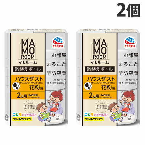 ハウスダストや花粉の浮遊・舞い散り防止に。※本製品はボトル(取替用)のみです。使用する場合は、別売りの器具(本体)をお買い求めください。スイッチを入れるだけで、成分が部屋中に広がって、アレルゲン(ハウスダスト・花粉)の吸入リスクを防ぎます。※マモルーム器具には、全てのマモルーム取替えボトルが使えます。目的に応じて使い分けることができます。■無力化して吸入リスクを防ぐ!(1)成分が部屋中に広がってハウスダストや花粉に付着します。(2)落下促進、床上の舞い散り防止により、ハウスダスト・花粉の吸入リスクを防ぎます。※無人の閉鎖空間で、模擬ハウスダスト・花粉を用いた評価により効果を確認しています。(メーカー試験)※本品は医薬品ではありません。※ハウスダスト(ダニのフン、PM2.5、カビ)・花粉の吸入を完全に防ぐものではありません。■子供部屋にも使えます。■スーッと鼻を突き抜けるユーカリの香り。【使用上の注意】●電源コードにキズ、亀裂等があったり、コードを動かすとランプが点滅する器具は、感電や発火の原因となり危険です。直ちにご使用を中止し、新しい器具と交換してください。●万一身体に異常が起きた場合や、液を誤って飲んだ場合は、本品を持参し、直ちに医師の診療を受ける。●ボトルの芯には薬液がついているので直接手を触れない。万一、皮膚に薬液がついた場合は、石けんを用いてよく洗う。●閉め切った部屋や狭い部屋で使用する場合は、時々注意して部屋の換気をする。体質や体調によっては頭痛、のどの痛み、不快感などの原因となります。●アレルギー体質の人は使用に注意する。●器具に針金やピン等を差し込んだり、ぬれた手で器具に触れたりしない。また器具やボトルに水・油等の液体をかけない。感電や故障の原因となります。●使用中、器具上部や蒸散口は熱くなるので、手で触れたり、中に指を入れたりしない。やけどの原因となるおそれがあります。●使用中及び使用後は乳幼児の手に触れさせない。●器具は正常な状態で使用し、横や逆さにしたり、吊るして使用しない。また器具を落としたり、衝撃を与えない。●火気に注意し、直接炎を近づけないこと。●蒸散成分がまれにうすい白煙として見えることがありますが、異常ではありません。●風が蒸散口に当たるなどの使用環境により、蒸散不良となり液漏れしたり、十分な効果が得られないことがあります。●通電中は薬液が連続して揮散するので、使用しないときは必ずスイッチを切る。●器具の上に新聞、ふとん、毛布、衣類などをかけない。熱がこもってコゲたり、器具が変形することがあります。●毛足の長いじゅうたんの上では使用しないでください。長時間使用すると、液漏れする場合があります。●液漏れの原因となることがあるので、直接日光が当たる所や、AV機器の上など高温になる所には置かない。●薬液をこぼした場合は、シミや変色のおそれがあるのですぐに拭き取る。薬液が付着すると、塗装面やプラスチックなどを傷めたり、床や畳を汚す場合があります。●直射日光を避け、乳幼児の手の届かない涼しい所に保管する。●3ヵ月から4ヵ月以上の長期にわたって使用しないときは、ボトルを器具からはずし、キャップを締めて保管する。残った液は翌年も引き続き使用できます。●マモルームのボトル以外のボトルを使用した場合の有効性、安全性は確認しておらず、また、発火等火災の危険を生じるおそれがありますので、マモルームのボトル以外は使用しないでください。■商品詳細メーカー名:アース製薬シリーズ名:マモルーム入数:1本入×2個内容量:45ml使用期間:約2ヵ月(1日24時間使用 約1440時間分)適用範囲:4.5畳〜12畳用途:ハウスダスト・花粉の浮遊舞い散り防止購入単位:1セット(2個)配送種別:在庫品成分:溶剤、香料※リニューアルに伴いパッケージや商品名等が予告なく変更される場合がございますが、予めご了承ください。※モニターの発色具合により色合いが異なる場合がございます。【検索用キーワード】4901080143211 SK8275 アース製薬 あーすせいやく earth EARTH アース あーす マモルーム まもるーむ MAMOROOM ハウスダスト花粉用 取替えボトル 2カ月用 1本入×2個 2カ月 2か月 2ヵ月 2ケ月 1440時間 1440時間用 ハウスダスト 花粉 ダニのフン PM2.5 カビ アレルギー アレルギー対策 アレルゲン アレルゲン対策 アレルブロック アレル物質 アレル物質対策 部屋 お部屋 室内 屋内 家の中 リビング 寝室 ベッドルーム 子供部屋 コンセント 置き型 設置 プラグ式 プラグ 取替え用 取り替えボトル 取り替え用 取替え 取り替え 浮遊 舞い散り防止 無力化 ユーカリ ユーカリの香り
