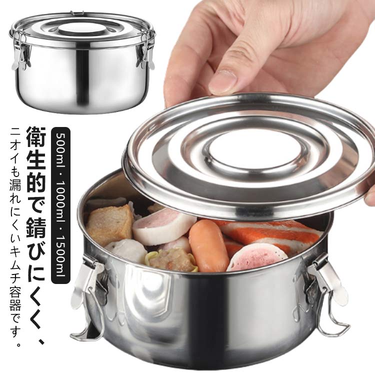保存容器 ステンレス製 キムチ保存 丸型 密閉性 食品保存 ふた付き 500ml 1000ml 1500ml 漏れ防止 臭い防止 フードコンテナ お弁当箱 ピクルス 漬物 おかずストッカー 冷蔵庫 送料無料